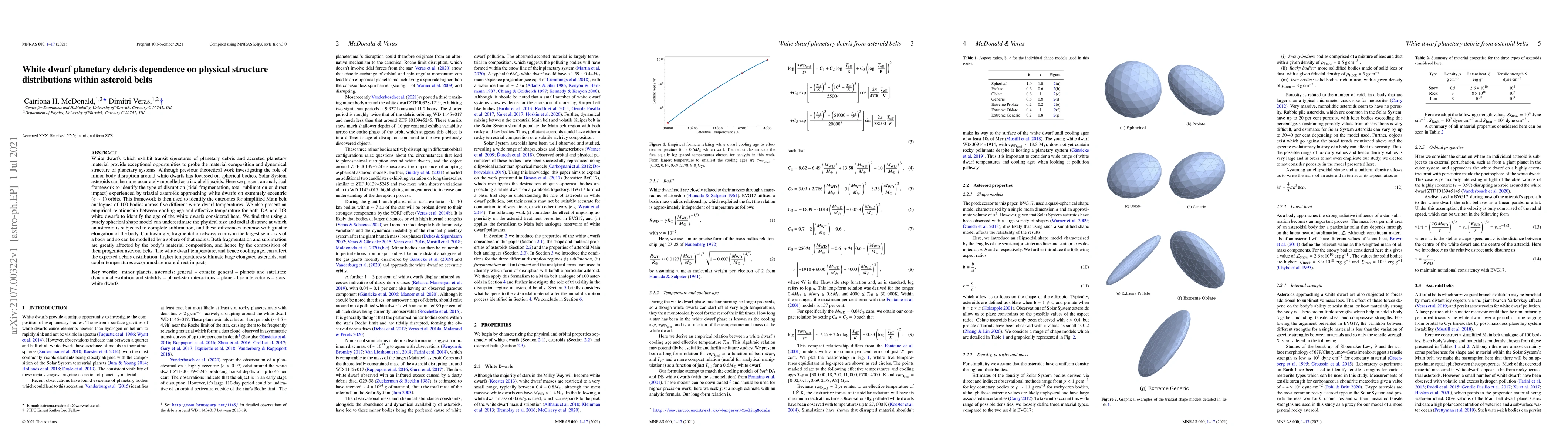 White dwarfs which exhibit transit signatures of planetary debris and accreted planetary material provide exceptional opportunities to probe the material composition and dynamical structure of planetary systems. Although previous theoretical work investigating the role of minor body disruption around white dwarfs has focussed on spherical bodies, Solar System asteroids can be more accurately modelled as triaxial ellipsoids. Here we present an analytical framework to identify the type of disruption (tidal fragmentation, total sublimation or direct impact) experienced by triaxial asteroids approaching white dwarfs on extremely eccentric (e \sim 1) orbits. This framework is then used to identify the outcomes for simplified Main belt analogues of 100 bodies across five different white dwarf temperatures. We also present an empirical relationship between cooling age and effective temperature for both DA and DB white dwarfs to identify the age of the white dwarfs considered here. We find that using a purely spherical shape model can underestimate the physical size and radial distance at which an asteroid is subjected to complete sublimation, and these differences increase with greater elongation of the body. Contrastingly, fragmentation always occurs in the largest semi-axis of a body and so can be modelled by a sphere of that radius. Both fragmentation and sublimation are greatly affected by the body's material composition, and hence by the composition of their progenitor asteroid belts. The white dwarf temperature, and hence cooling age, can affect the expected debris distribution: higher temperatures sublimate large elongated asteroids, and cooler temperatures accommodate more direct impacts.