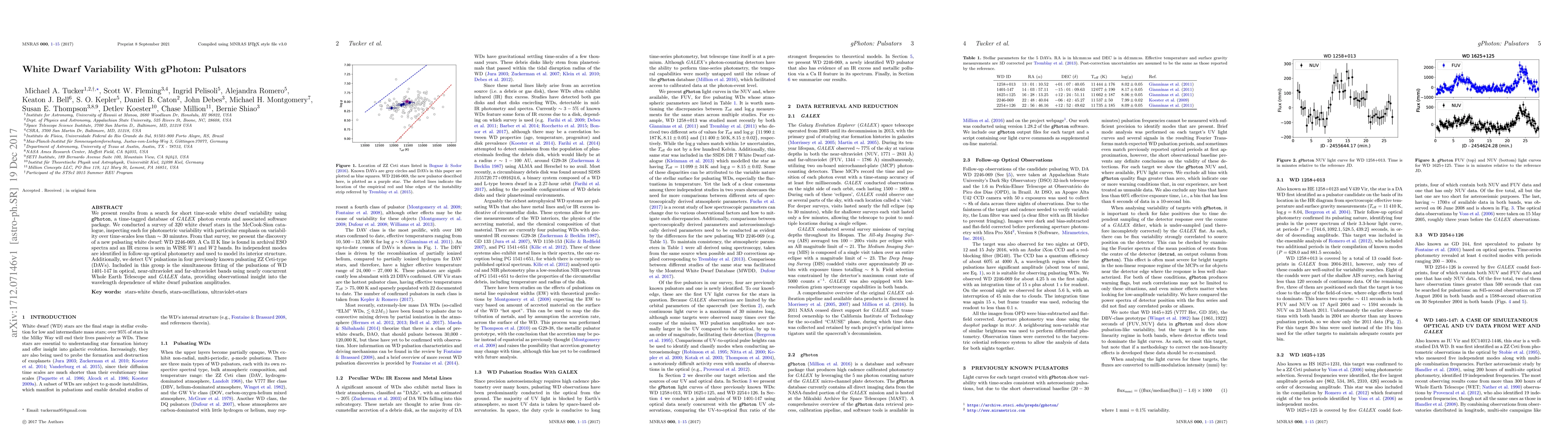 We present results from a search for short time-scale white dwarf variability using \texttt{gPhoton}, a time-tagged database of \textit{GALEX} photon events and associated software package. We conducted a survey of $320$ white dwarf stars in the McCook-Sion catalogue, inspecting each for photometric variability with particular emphasis on variability over time-scales less than $\sim 30$ minutes. From that survey, we present the discovery of a new pulsating white dwarf: WD 2246-069. A Ca II K line is found in archival ESO spectra and an IR excess is seen in WISE $W1$ and $W2$ bands. Its independent modes are identified in follow-up optical photometry and used to model its interior structure. Additionally, we detect UV pulsations in four previously known pulsating ZZ Ceti-type (DAVs). Included in this group is the simultaneous fitting of the pulsations of WD 1401-147 in optical, near-ultraviolet and far-ultraviolet bands using nearly concurrent Whole Earth Telescope and \textit{GALEX} data, providing observational insight into the wavelength dependence of white dwarf pulsation amplitudes.