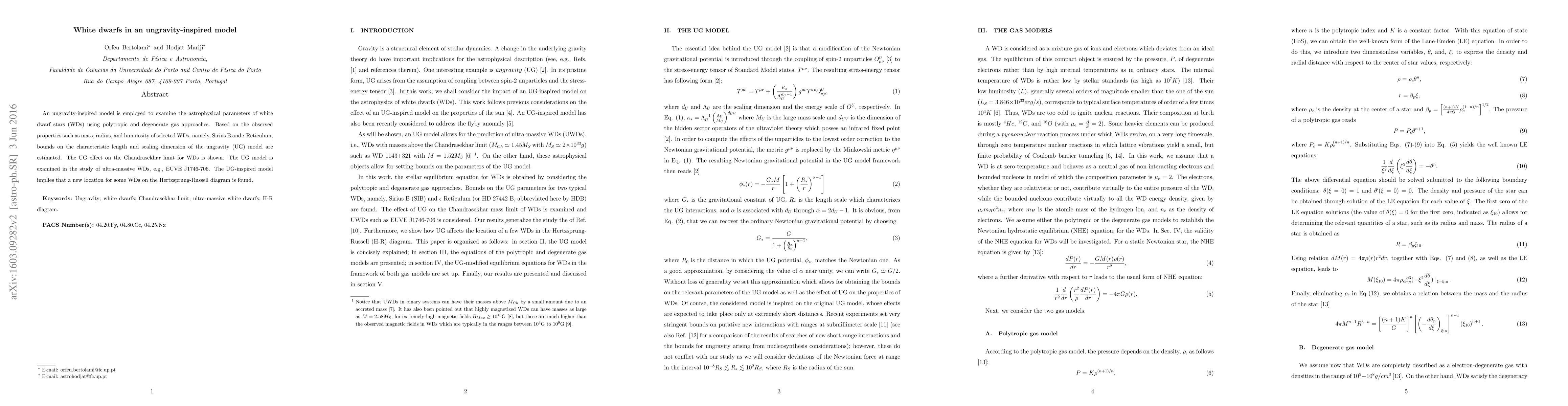 An ungravity-inspired model is employed to examine the astrophysical parameters of white dwarf stars (WDs) using polytropic and degenerate gas approaches. Based on the observed properties such as mass, radius, and luminosity of selected WDs, namely, Sirius B and $\epsilon$ Reticulum, bounds on the characteristic length and scaling dimension of the ungravity (UG) model are estimated. The UG effect on the Chandrasekhar limit for WDs is shown. The UG model is examined in the study of ultra-massive WDs, e.g., EUVE J1746-706. In the contact of UG inspired model, a new location for some WDs on the Hertzsprung-Russell diagram is found.