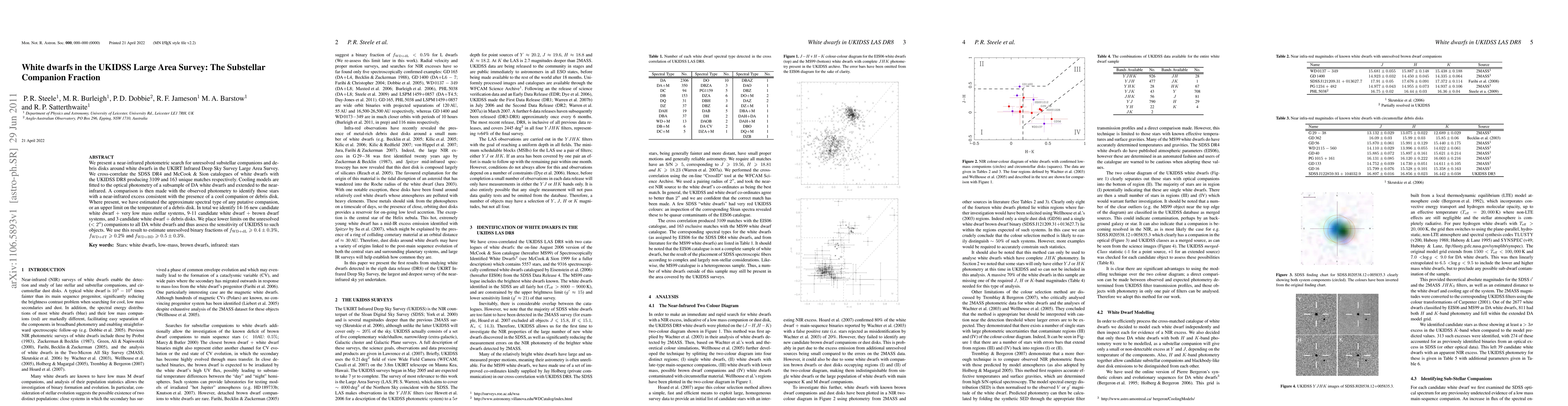 We present a near-infrared photometric search for unresolved substellar companions and debris disks around white dwarfs in the UKIRT Infrared Deep Sky Survey Large Area Survey. We cross-correlate the SDSS DR4 and McCook & Sion catalogues of white dwarfs with the UKIDSS DR8 producing 3109 and 163 unique matches respectively. Cooling models are fitted to the optical photometry of a subsample of DA white dwarfs and extended to the near-infrared. A comparison is then made with the observed photometry to identify those stars with a near-infrared excess consistent with the presence of a cool companion or debris disk. Where present, we have estimated the approximate spectral type of any putative companion, or an upper limit on the temperature of a debris disk. In total we identify 14-16 new candidate white dwarf + very low mass stellar systems, 9-11 candidate white dwarf + brown dwarf systems, and 3 candidate white dwarf + debris disks. We place lower limits on the unresolved (<2") companions to all DA white dwarfs and thus assess the sensitivity of UKIDSS to such objects. We use this result to estimate unresolved binary fractions of f(WD+dL)>0.4+/-0.3%, f(WD+dT)>0.2% and f(WD+BD)>0.5+/-0.3%.