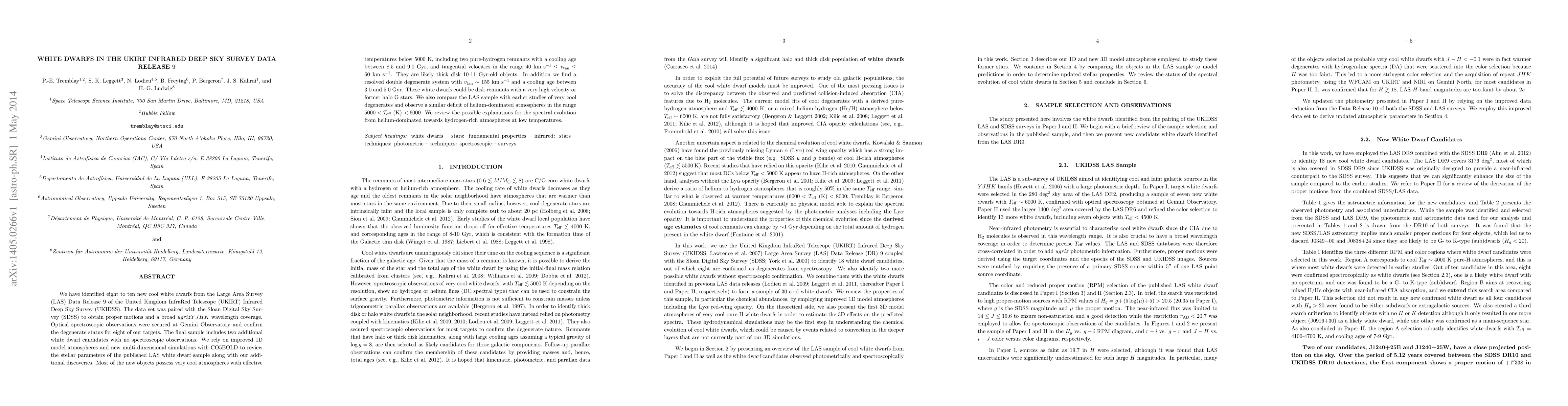 We have identified eight to ten new cool white dwarfs from the Large Area Survey (LAS) Data Release 9 of the United Kingdom InfraRed Telescope (UKIRT) Infrared Deep Sky Survey (UKIDSS). The data set was paired with the Sloan Digital Sky Survey (SDSS) to obtain proper motions and a broad ugrizYJHK wavelength coverage. Optical spectroscopic observations were secured at Gemini Observatory and confirm the degenerate status for eight of our targets. The final sample includes two additional white dwarf candidates with no spectroscopic observations. We rely on improved 1D model atmospheres and new multi-dimensional simulations with CO5BOLD to review the stellar parameters of the published LAS white dwarf sample along with our additional discoveries. Most of the new objects possess very cool atmospheres with effective temperatures below 5000 K, including two pure-hydrogen remnants with a cooling age between 8.5 and 9.0 Gyr, and tangential velocities in the range 40 km/s < vtan < 60 km/s. They are likely thick disk 10-11 Gyr-old objects. In addition we find a resolved double degenerate system with vtan ~ 155 km/s and a cooling age between 3.0 and 5.0 Gyr. These white dwarfs could be disk remnants with a very high velocity or former halo G stars. We also compare the LAS sample with earlier studies of very cool degenerates and observe a similar deficit of helium-dominated atmospheres in the range 5000 < Teff (K) < 6000. We review the possible explanations for the spectral evolution from helium-dominated towards hydrogen-rich atmospheres at low temperatures.