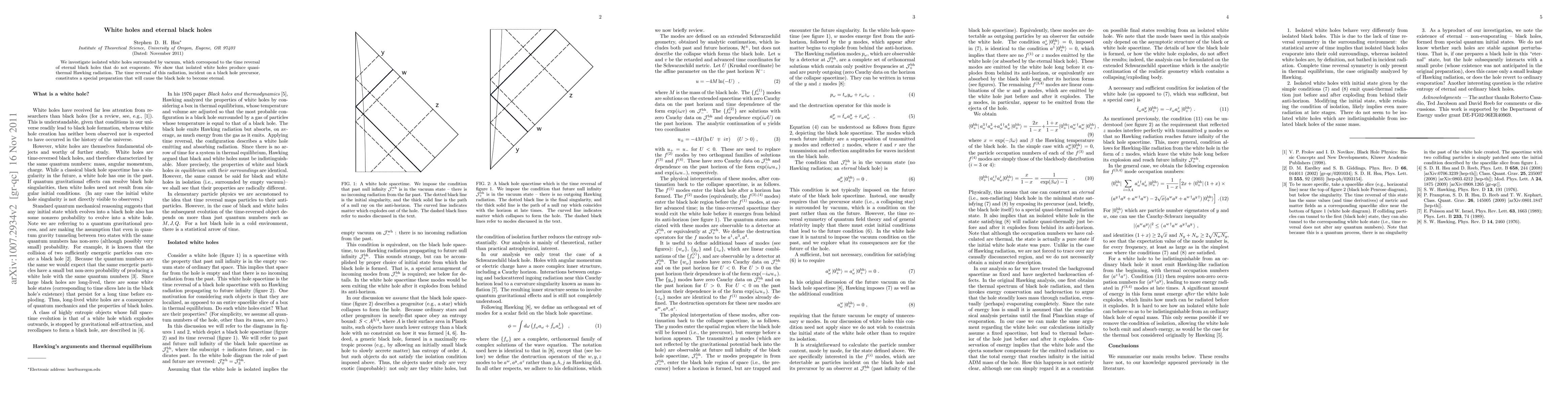 Summary: This research explores isolated white holes, the time-reversed counterparts of eternal black holes, revealing they emit quasi-thermal Hawking radiation. This radiation, when reversed and incident on a black hole precursor, can transform it into an eternal black hole.