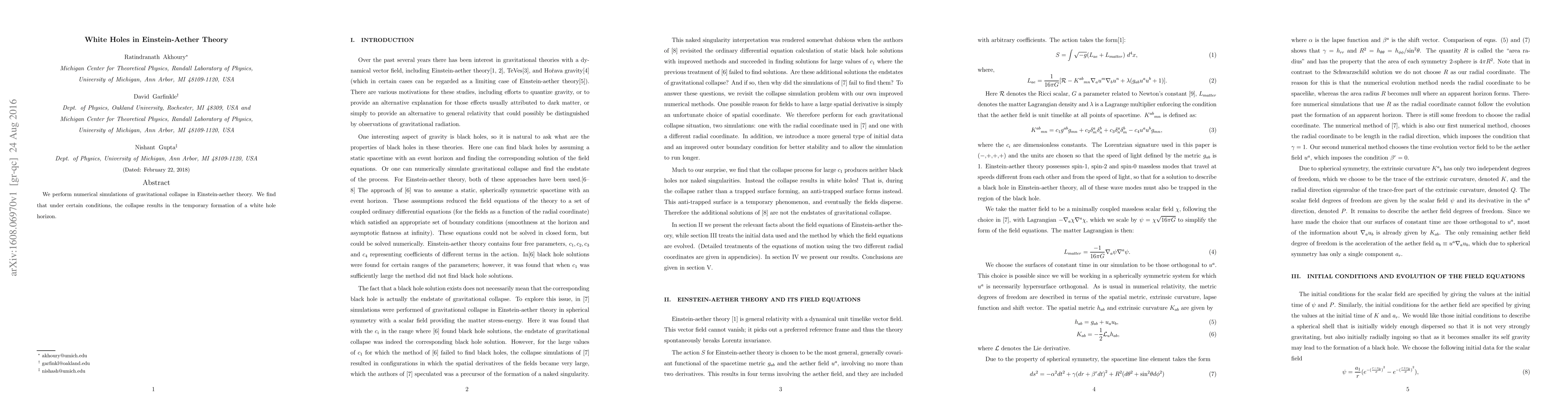 The research employs numerical simulations of gravitational collapse in Einstein-aether theory to investigate white hole formation under specific conditions.