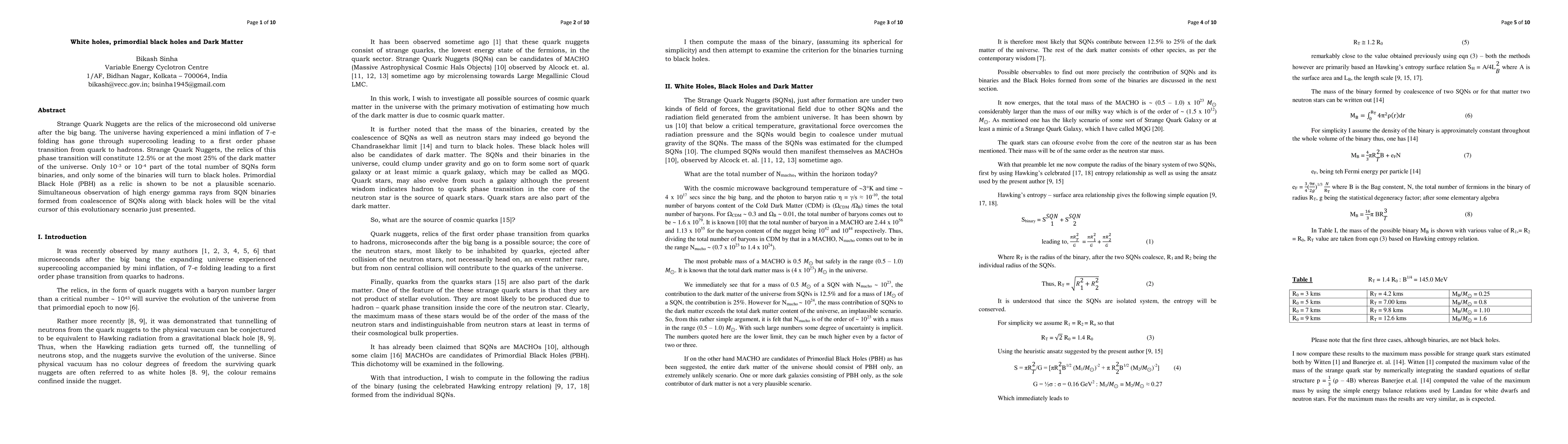 Strange Quark Nuggets are the relics of the microsecond old universe after the big bang. The universe having experienced a mini inflation of 7-e folding has gone through supercooling leading to a first order phase transition from quark to hadrons. Strange Quark Nuggets, the relics of this phase transition will constitute 12.5% or at the most 25% of the dark matter of the universe. Only 10-3 or 10-4 part of the total number of SQNs form binaries, and only some of the binaries will turn to black holes. Primordial Black Hole (PBH) as a relic is shown to be not a plausible scenario. Simultaneous observation of high energy gamma rays from SQN binaries formed from coalescence of SQNs along with black holes will be the vital cursor of this evolutionary scenario just presented.