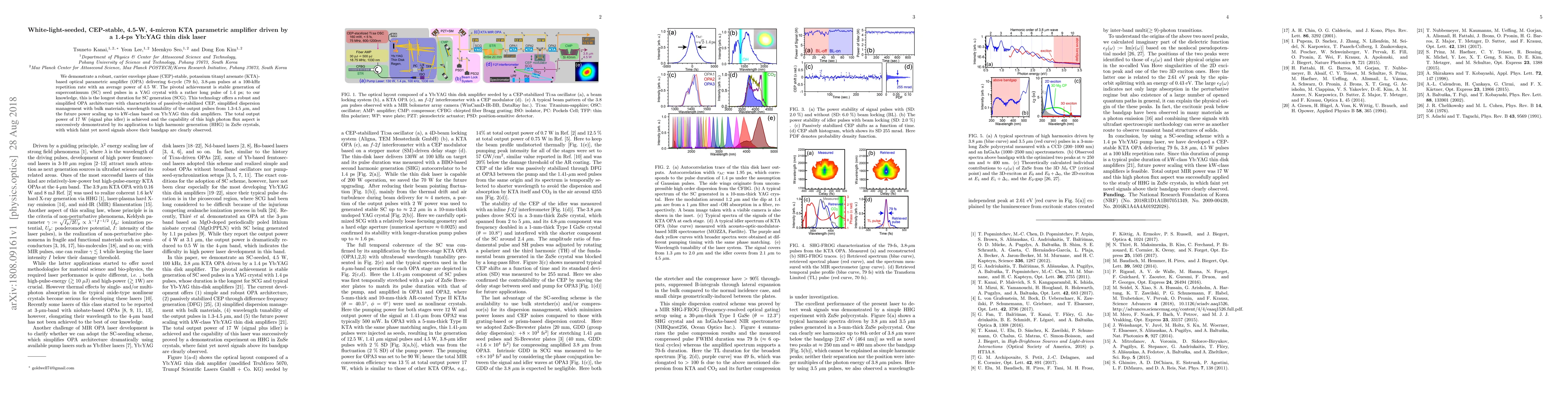 The paper presents a novel, CEP-stable KTA OPA seeded by a 1.4 ps Yb:YAG thin disk laser, delivering 4.5 W, 79 fs, 3.8 µm pulses at 100 kHz with simplified dispersion management and passively-stabilized CEP.