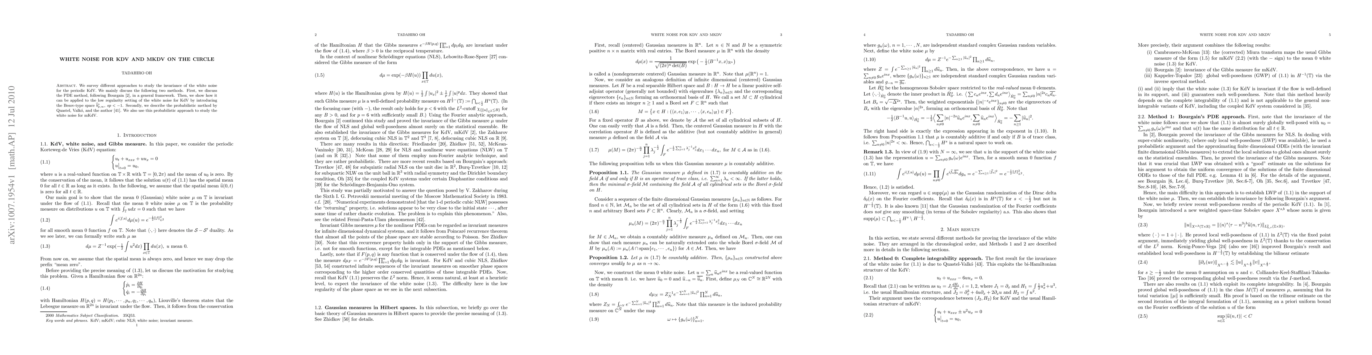 We survey different approaches to study the invariance of the white noise for the periodic KdV. We mainly discuss the following two methods. First, we discuss the PDE method, following Bourgain \cite{BO4}, in a general framework. Then, we show how it can be applied to the low regularity setting of the white noise for KdV by introducing the Besov-type space \hat{b}^s_{p, \infty}, sp< -1. Secondly, we describe the probabilistic method by Quastel, Valk\'o, and the author \cite{OQV}. We also use this probabilistic approach to study the white noise for mKdV.