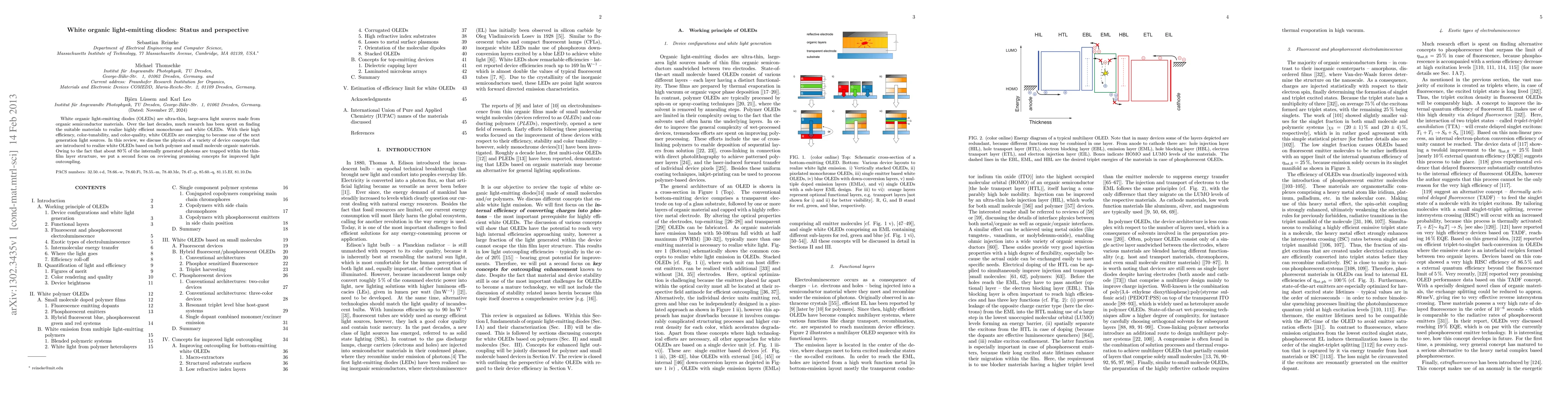 This paper reviews the development and physics of white organic light-emitting diodes (OLEDs), emphasizing both polymer and small molecule materials. It also highlights strategies for enhancing light outcoupling efficiency, addressing the challenge of photon trapping within the thin-film structure.