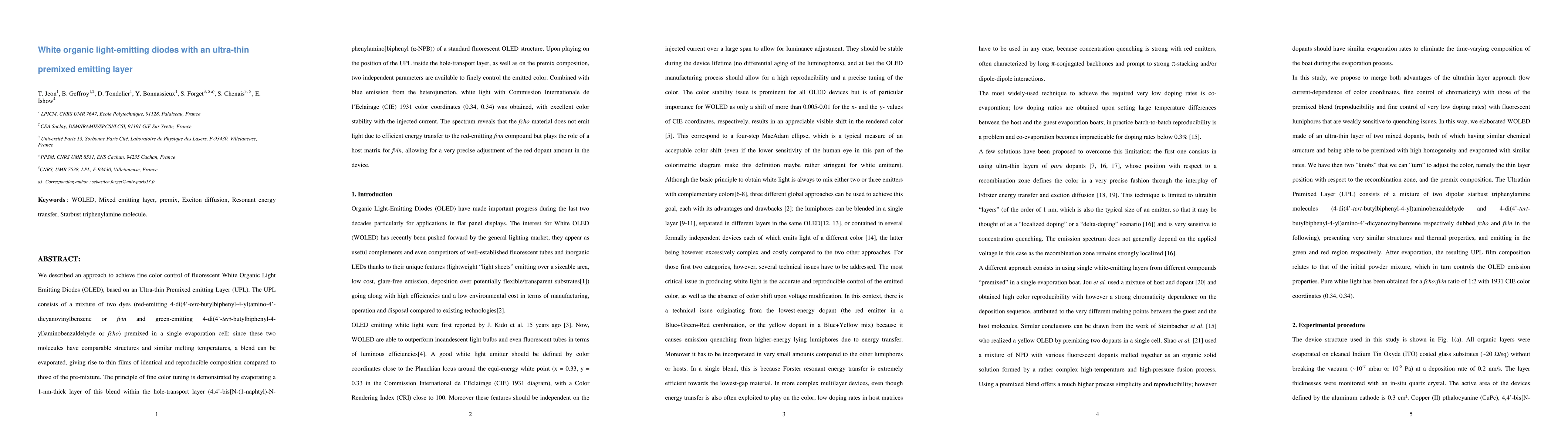This paper presents a method for fine color control in white Organic Light-Emitting Diodes (OLEDs) using an Ultra-thin Premixed emitting Layer (UPL) composed of red and green dyes. The UPL allows for precise tuning of emitted color by adjusting the dye blend composition and position within the device, achieving stable white light with excellent color stability.