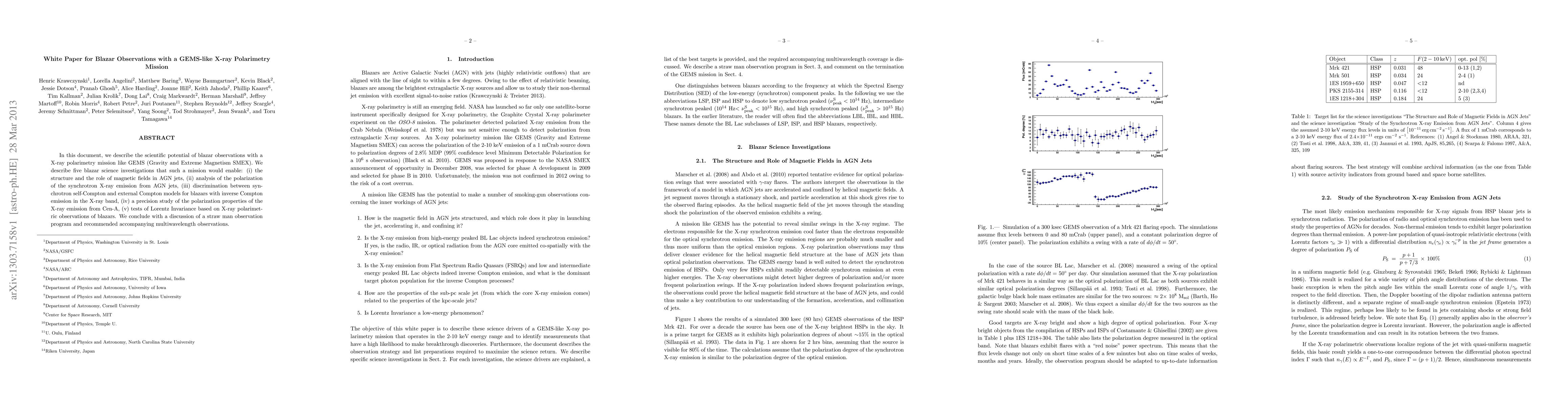 In this document, we describe the scientific potential of blazar observations with a X-ray polarimetry mission like GEMS (Gravity and Extreme Magnetism SMEX). We describe five blazar science investigations that such a mission would enable: (i) the structure and the role of magnetic fields in AGN jets, (ii) analysis of the polarization of the synchrotron X-ray emission from AGN jets, (iii) discrimination between synchrotron self-Compton and external Compton models for blazars with inverse Compton emission in the X-ray band, (iv) a precision study of the polarization properties of the X-ray emission from Cen-A, (v) tests of Lorentz Invariance based on X-ray polarimetric observations of blazars. We conclude with a discussion of a straw man observation program and recommended accompanying multiwavelength observations.