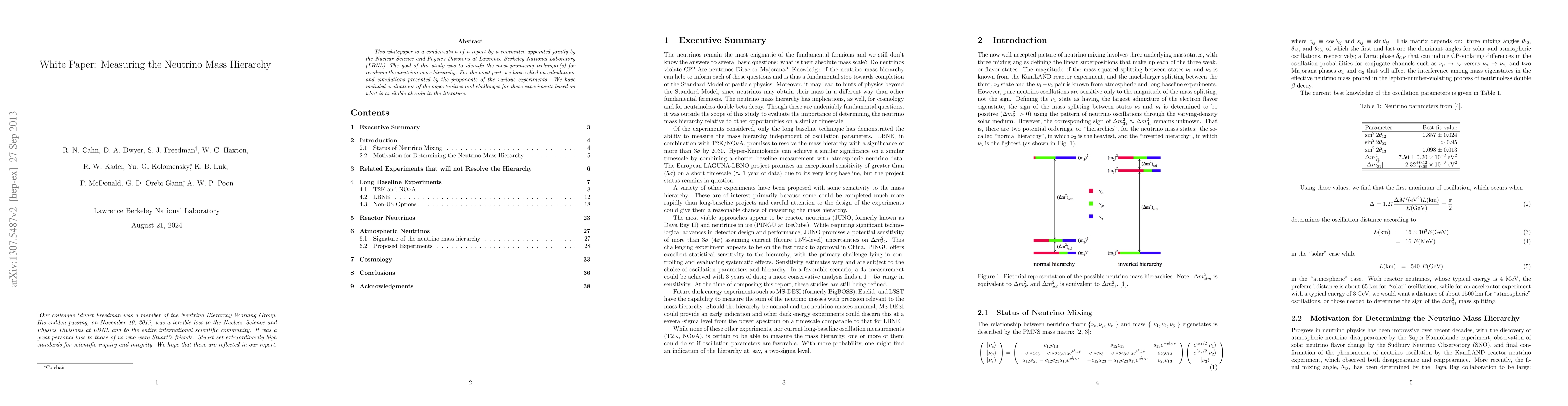 This white paper is a condensation of a report by a committee appointed jointly by the Nuclear Science and Physics Divisions at Lawrence Berkeley National Laboratory (LBNL). The goal of this study was to identify the most promising technique(s) for resolving the neutrino mass hierarchy. For the most part, we have relied on calculations and simulations presented by the proponents of the various experiments. We have included evaluations of the opportunities and challenges for these experiments based on what is available already in the literature.