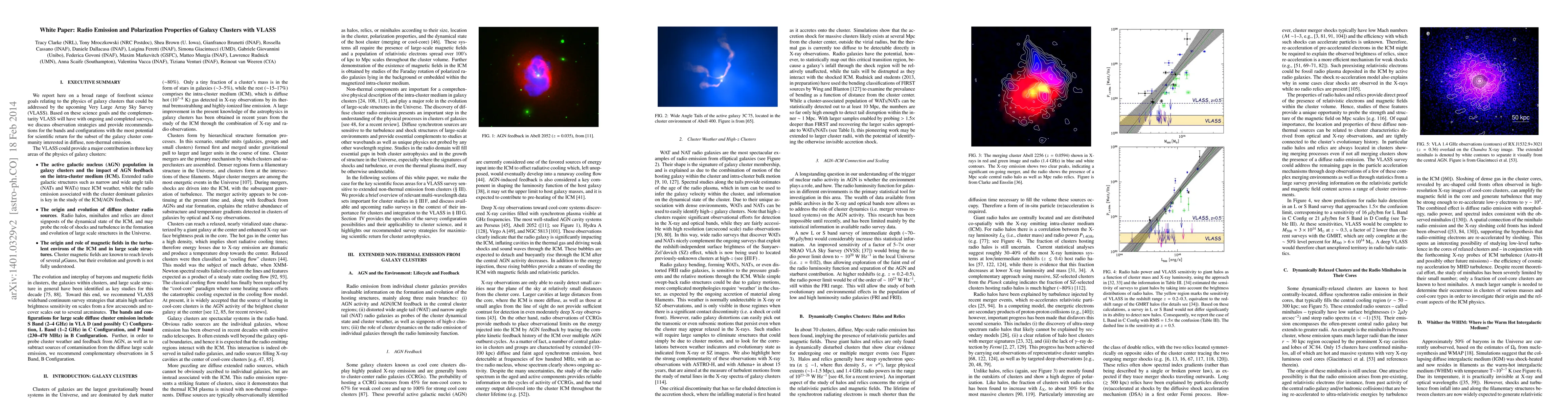 We outline the science case for extended radio emission and polarization in galaxy clusters which would be a scientifically important area of research for an upcoming Jansky Very Large Array Sky Survey. The survey would provide a major contribution in three key areas of the physics of clusters: 1) the active galactic nucleus population and the impact of feedback on the evolution of the intra-cluster medium, 2) the origin and evolution of diffuse cluster radio sources to probe the physics of mergers with implications for cosmology, and 3) the origin and role of magnetic fields in the ICM and in large scale structures. Considering all three areas, a survey must have sufficient spatial resolution to study the tailed galaxies which trace the cluster weather as well as the radio lobes driving energy into the cluster from the central AGN. The survey must also have sensitivity to low surface brightness emission and large angular scales to probe radio halos and relics as well as the WHIM residing in the large scale structure filaments. Finally, we note that full polarization information would be a highly valuable tool to probe a number of cluster-related issues. Due to the general steep spectral index of the emission we consider the survey is best suited to this science when conducted in P, L, or S bands. We conclude that the choices of S Band + D Configuration, L Band + C Configuration, and P Band + B Configuration offer optimal resolutions for constraining galactic interactions and feedback in cluster environments, while still probing large scale structure and the bulk cluster environment itself. While the push to probe higher redshifts and lower mass limits strongly favors a narrow and deep (or even targeted) survey strategy, we note that a wide survey covering roughly 1/4-2/3 of the sky will have significant scientific return, discovery potential, and archival value.