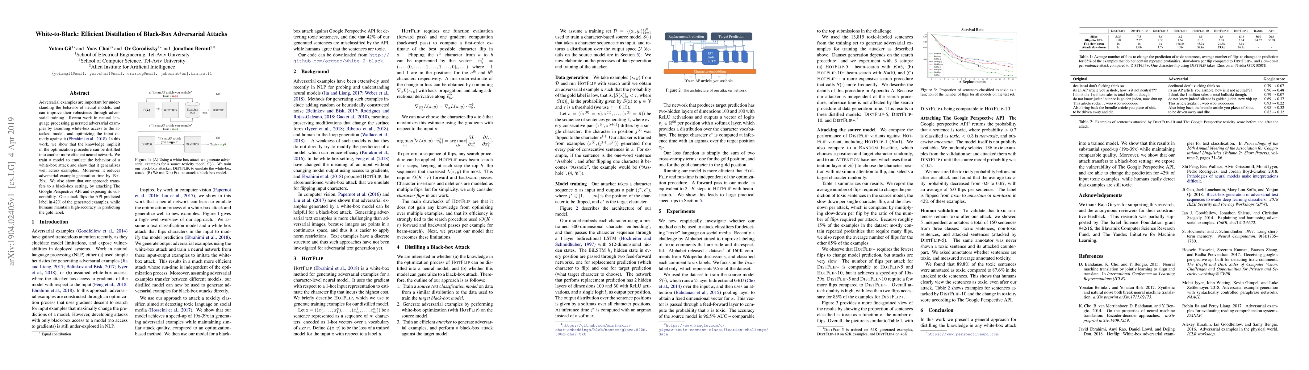 This paper presents an efficient method to distill white-box adversarial attacks into a black-box setting, reducing generation time by 19x-39x. The distilled model successfully transfers to attack the Google Perspective API, demonstrating its effectiveness in a black-box context.