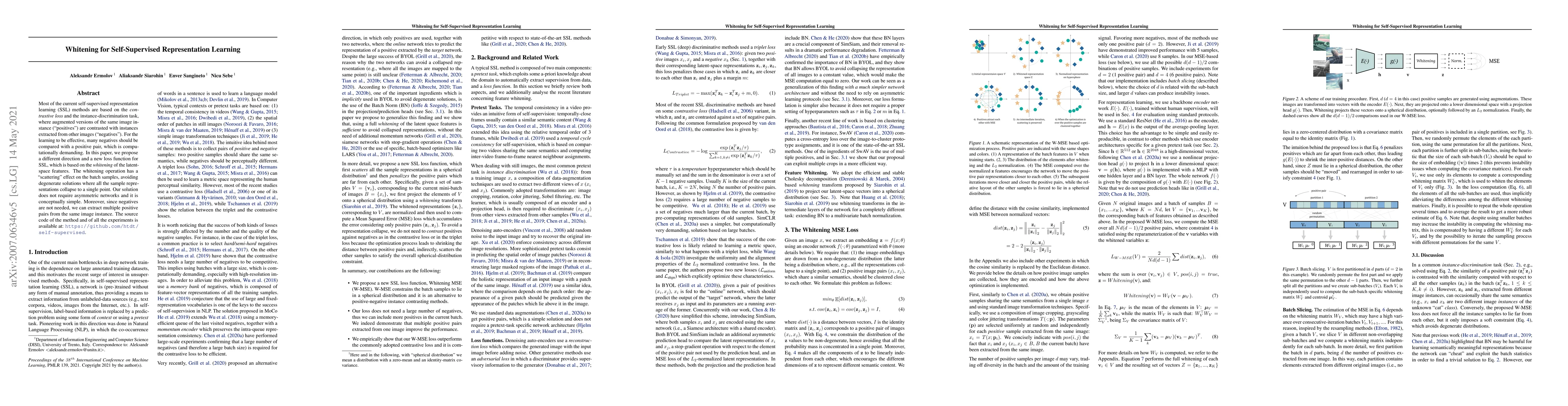 This paper proposes a novel self-supervised learning method based on a whitening loss function that scatters batch samples, avoiding degenerate solutions. Unlike contrastive methods, it does not require negative samples, enabling multiple positive pairs from the same image and simplifying the network architecture.