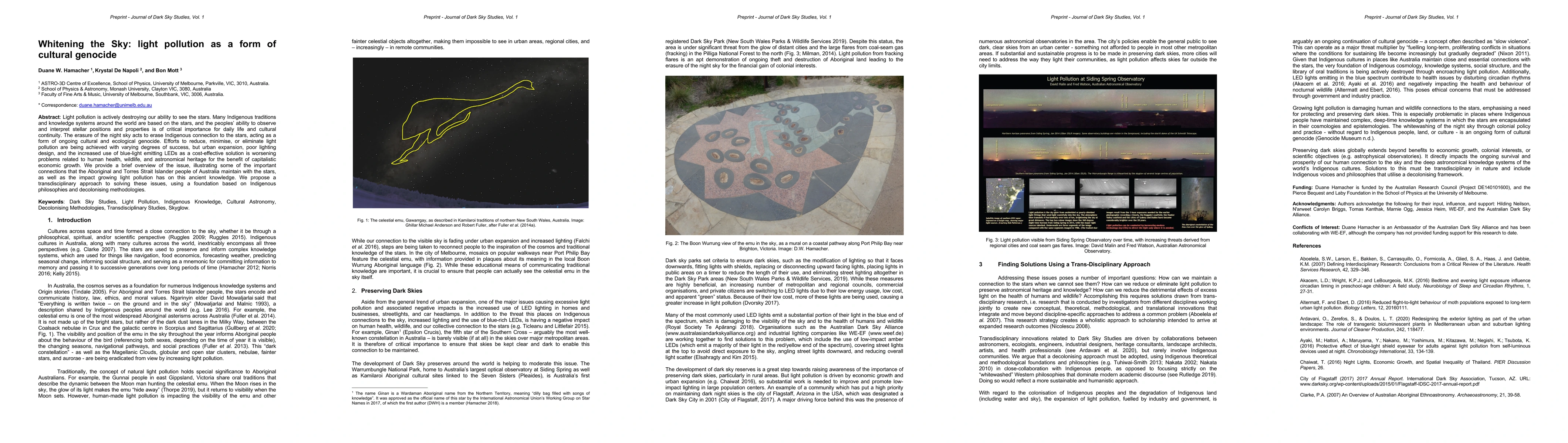 Light pollution is actively destroying our ability to see the stars. Many Indigenous traditions and knowledge systems around the world are based on the stars, and the peoples' ability to observe and interpret stellar positions and properties is of critical importance for daily life and cultural continuity. The erasure of the night sky acts to erase Indigenous connection to the stars, acting as a form of ongoing cultural and ecological genocide. Efforts to reduce, minimise, or eliminate light pollution are being achieved with varying degrees of success, but urban expansion, poor lighting design, and the increased use of blue-light emitting LEDs as a cost-effective solution is worsening problems related to human health, wildlife, and astronomical heritage for the benefit of capitalistic economic growth. We provide a brief overview of the issue, illustrating some of the important connections that the Aboriginal and Torres Strait Islander people of Australia maintain with the stars, as well as the impact growing light pollution has on this ancient knowledge. We propose a transdisciplinary approach to solving these issues, using a foundation based on Indigenous philosophies and decolonising methodologies.