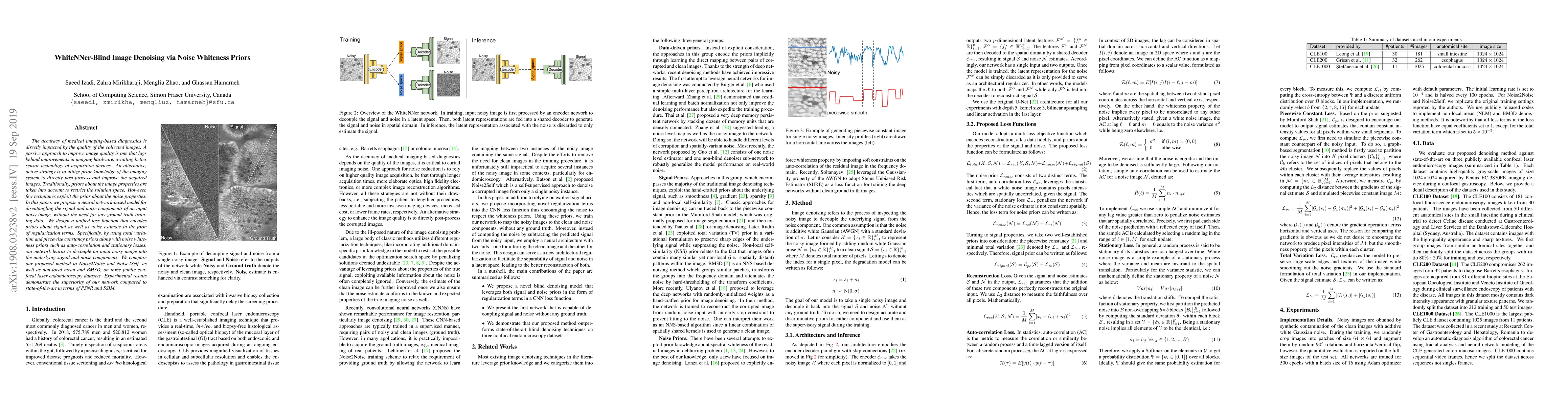 The accuracy of medical imaging-based diagnostics is directly impacted by the quality of the collected images. A passive approach to improve image quality is one that lags behind improvements in imaging hardware, awaiting better sensor technology of acquisition devices. An alternative, active strategy is to utilize prior knowledge of the imaging system to directly post-process and improve the acquired images. Traditionally, priors about the image properties are taken into account to restrict the solution space. However, few techniques exploit the prior about the noise properties. In this paper, we propose a neural network-based model for disentangling the signal and noise components of an input noisy image, without the need for any ground truth training data. We design a unified loss function that encodes priors about signal as well as noise estimate in the form of regularization terms. Specifically, by using total variation and piecewise constancy priors along with noise whiteness priors such as auto-correlation and stationary losses, our network learns to decouple an input noisy image into the underlying signal and noise components. We compare our proposed method to Noise2Noise and Noise2Self, as well as non-local mean and BM3D, on three public confocal laser endomicroscopy datasets. Experimental results demonstrate the superiority of our network compared to state-of-the-art in terms of PSNR and SSIM.