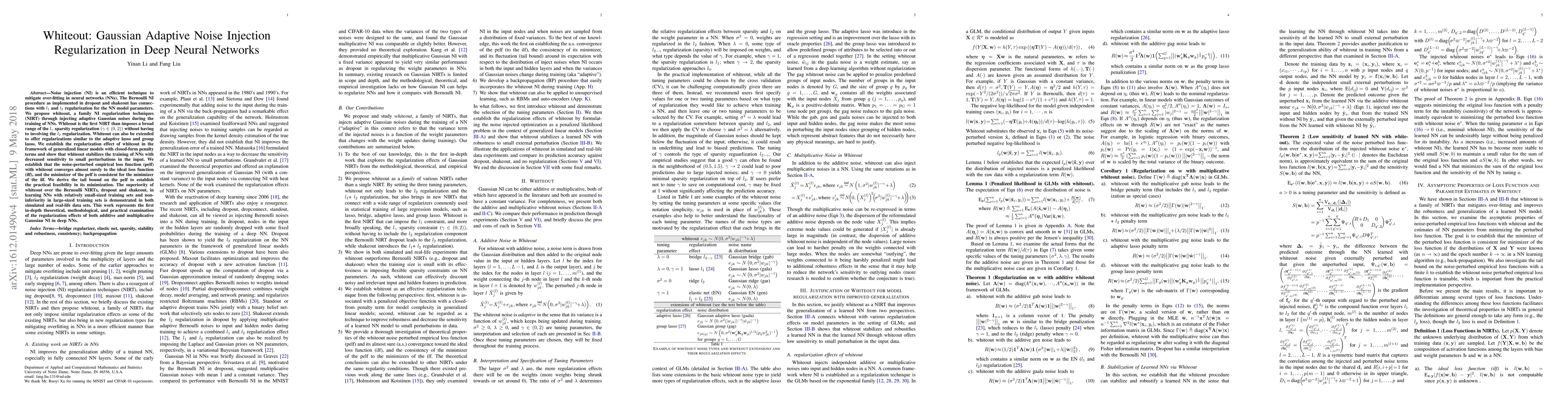 Noise injection (NI) is an efficient technique to mitigate over-fitting in neural networks (NNs). The Bernoulli NI procedure as implemented in dropout and shakeout has connections with $l_1$ and $l_2$ regularization for the NN model parameters. We propose whiteout, a family NI regularization techniques (NIRT) through injecting adaptive Gaussian noises during the training of NNs. Whiteout is the first NIRT than imposes a broad range of the $l_{\gamma}$ sparsity regularization $(\gamma\in(0,2))$ without having to involving the $l_2$ regularization. Whiteout can also be extended to offer regularizations similar to the adaptive lasso and group lasso. We establish the regularization effect of whiteout in the framework of generalized linear models with closed-form penalty terms and show that whiteout stabilizes the training of NNs with decreased sensitivity to small perturbations in the input. We establish that the noise-perturbed empirical loss function (pelf) with whiteout converges almost surely to the ideal loss function (ilf), and the minimizer of the pelf is consistent for the minimizer of the ilf. We derive the tail bound on the pelf to establish the practical feasibility in its minimization. The superiority of whiteout over the Bernoulli NIRTs, dropout and shakeout, in learning NNs with relatively small-sized training sets and non-inferiority in large-sized training sets is demonstrated in both simulated and real-life data sets. This work represents the first in-depth theoretical, methodological, and practical examination of the regularization effects of both additive and multiplicative Gaussian NI in deep NNs.
