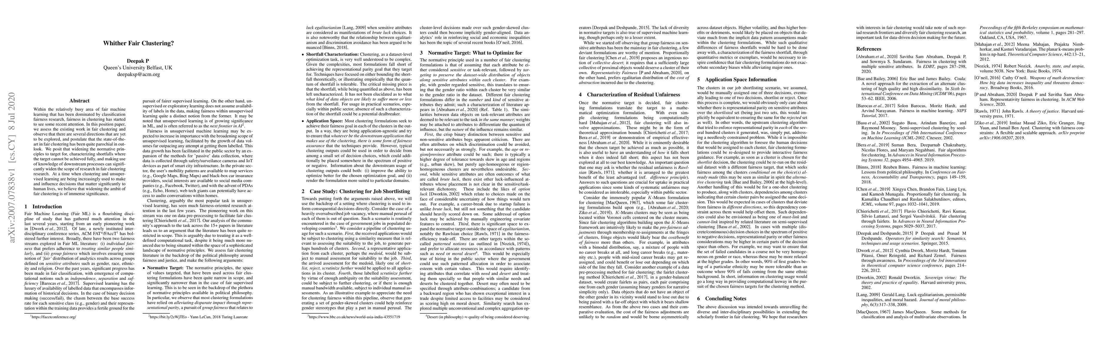 This paper reviews current research in fair clustering, noting that it has been limited and narrowly focused. It suggests expanding the scope by adopting broader normative principles, addressing shortfalls, and leveraging knowledge of downstream processes to enhance the significance and impact of fair clustering research.
