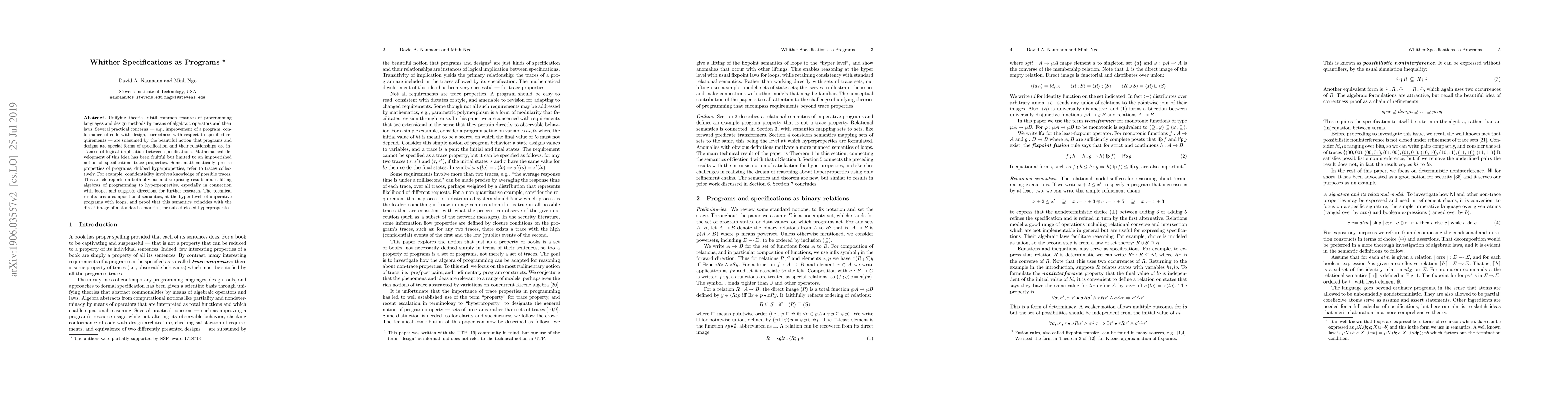 This paper explores the unification of programming languages and design methods through algebraic operators, emphasizing the notion that programs are specifications. It introduces hyperproperties, which consider collective traces, and presents a compositional semantics for imperative programs with loops, proving its equivalence with standard semantics for subset closed hyperproperties.