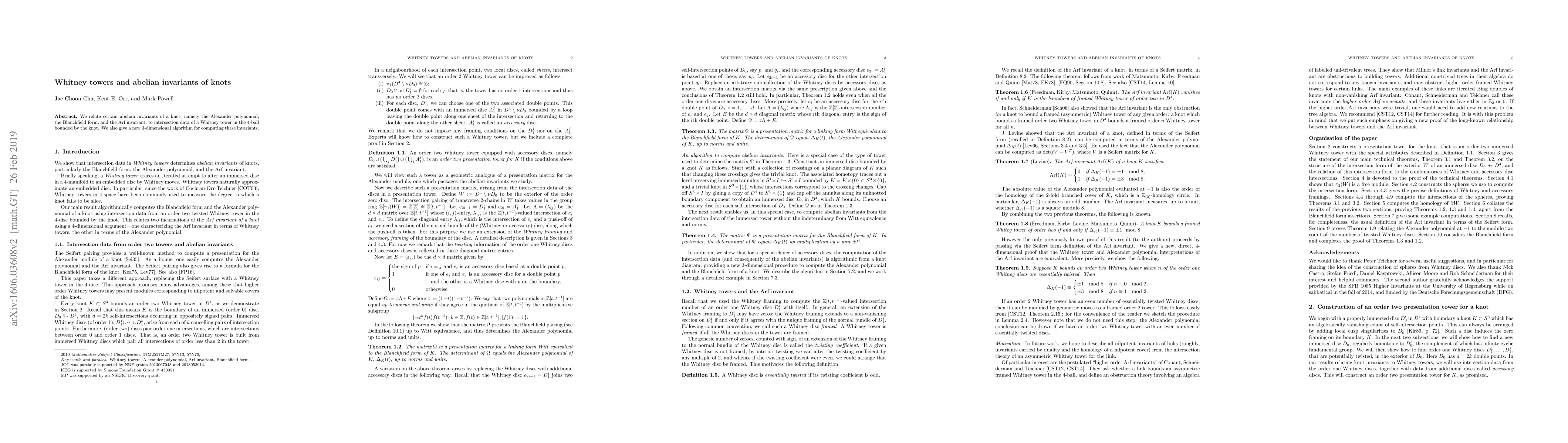 We relate certain abelian invariants of a knot, namely the Alexander polynomial, the Blanchfield form, and the Arf invariant, to intersection data of a Whitney tower in the 4-ball bounded by the knot. We also give a new 3-dimensional algorithm for computing these invariants.