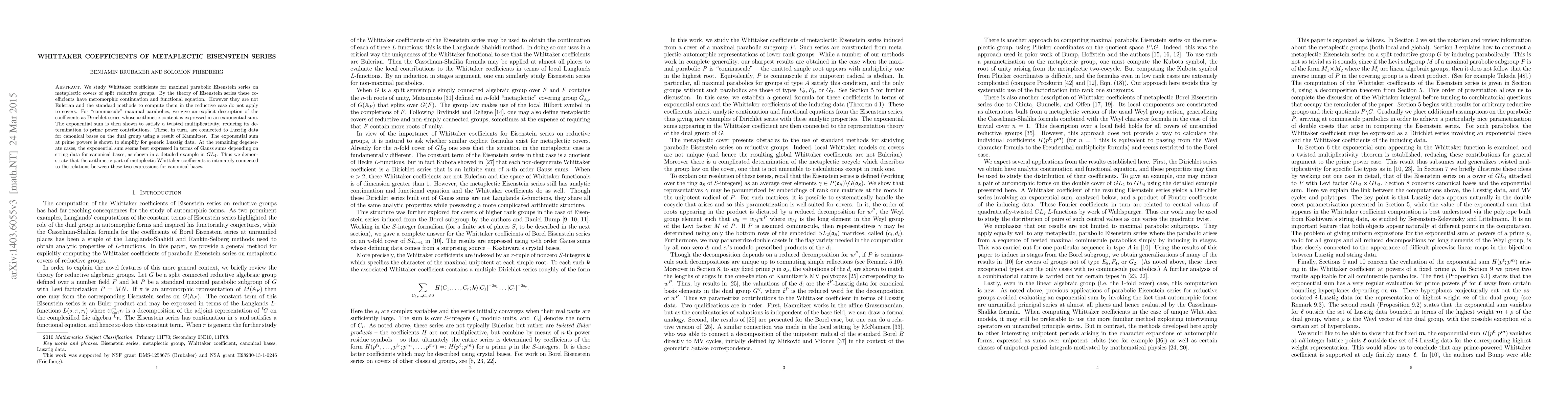 This paper investigates Whittaker coefficients for metaplectic Eisenstein series on split reductive groups, providing an explicit description for "cominuscule" maximal parabolics as Dirichlet series linked to Lusztig data and string data. It shows the exponential sum's twisted multiplicativity and connects the arithmetic content to canonical bases through prime power contributions and string data.