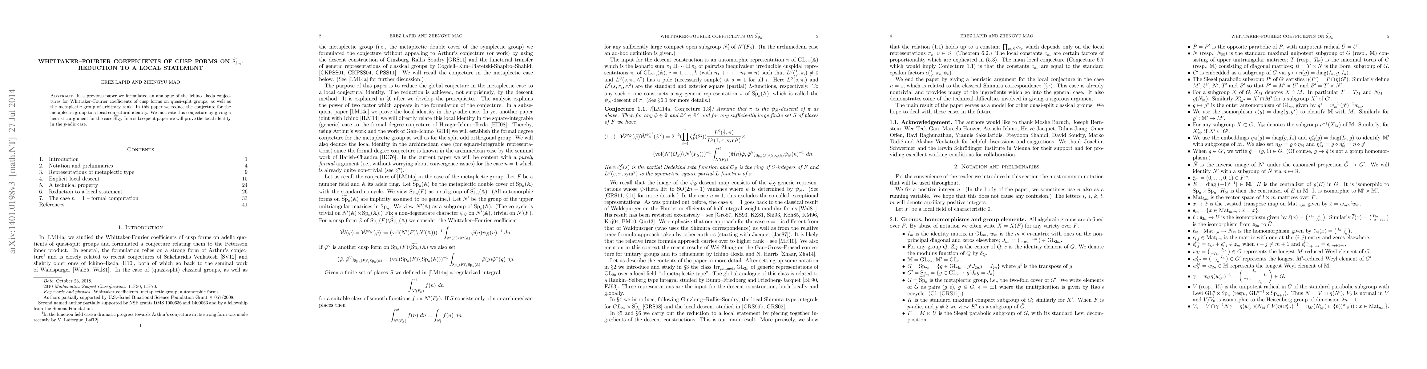 In a previous paper we formulated an analogue of the Ichino-Ikeda conjectures for Whittaker-Fourier coefficients of cusp forms on quasi-split groups, as well as the metaplectic group of arbitrary rank. In this paper we reduce the conjecture for the metaplectic group to a local conjectural identity. We motivate this conjecture by giving a heuristic argument for the case $\widetilde{SL}_2$. In a subsequent paper we will prove the local identity in the $p$-adic case.