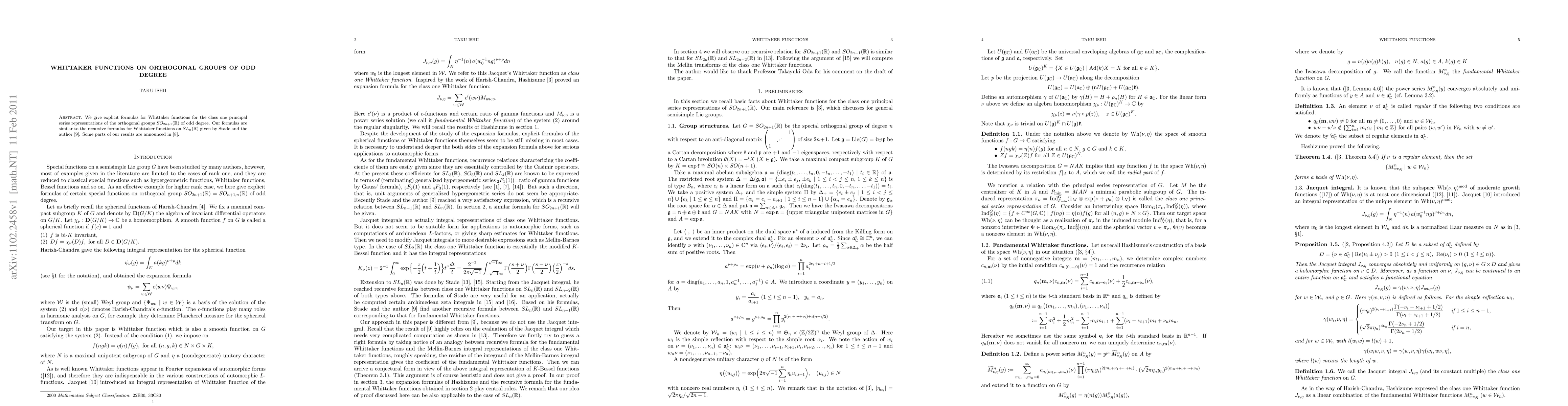 We give explicit formulas for Whittaker functions for the class one principal series representations of the orthogonal groups $ SO_{2n+1}(\R) $ of odd degree. Our formulas are similar to the recursive formulas for Whittaker functions on $SL_n(\R)$ given by Stade and the author \cite{ISt}. Some parts of our results are announced in \cite{I3}.