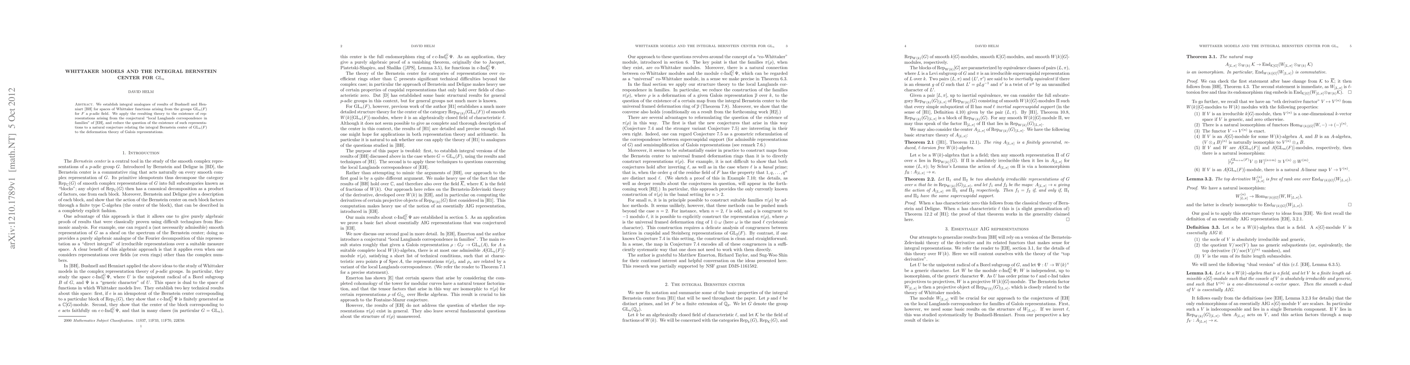 This paper establishes integral analogues of Whittaker models for GL_n(F) over p-adic fields, and applies this theory to investigate representations linked to the local Langlands correspondence, reducing the problem to a conjecture about the integral Bernstein center and Galois deformation theory.
