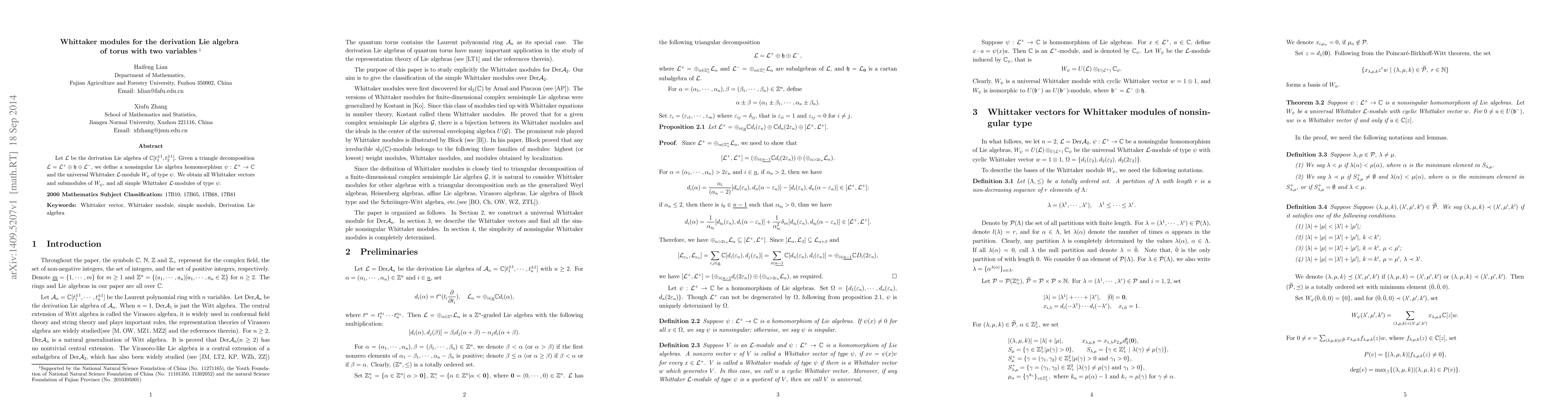 Let $\mathcal{L}$ be the derivation Lie algebra of ${\mathbb C}[t_1^{\pm 1},t_2^{\pm 1}]$. Given a triangle decomposition $\mathcal{L} =\mathcal{L}^{+}\oplus\mathfrak{h}\oplus\mathcal{L}^{-}$, we define a nonsingular Lie algebra homomorphism $\psi:\mathcal{L}^{+}\rightarrow\mathbb{C}$ and the universal Whittaker $\mathcal{L}$-module $W_{\psi}$ of type $\psi$. We obtain all Whittaker vectors and submodules of $W_{\psi}$, and all simple Whittaker $\mathcal{L}$-modules of type $\psi$.