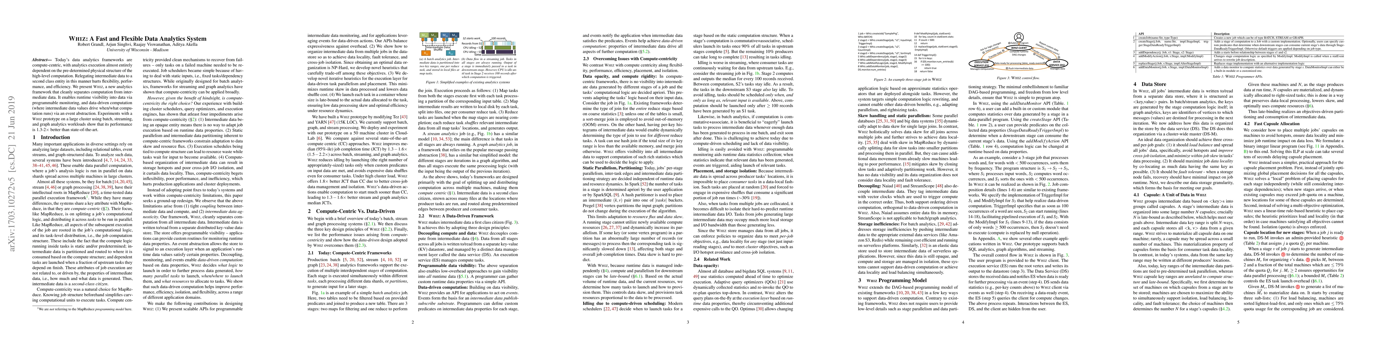 Whiz is a novel data analytics framework that separates computation from intermediate data, enhancing flexibility and performance. It employs programmable monitoring and event-driven computation, achieving 1.3-2x better performance than state-of-the-art systems in various analytics workloads.