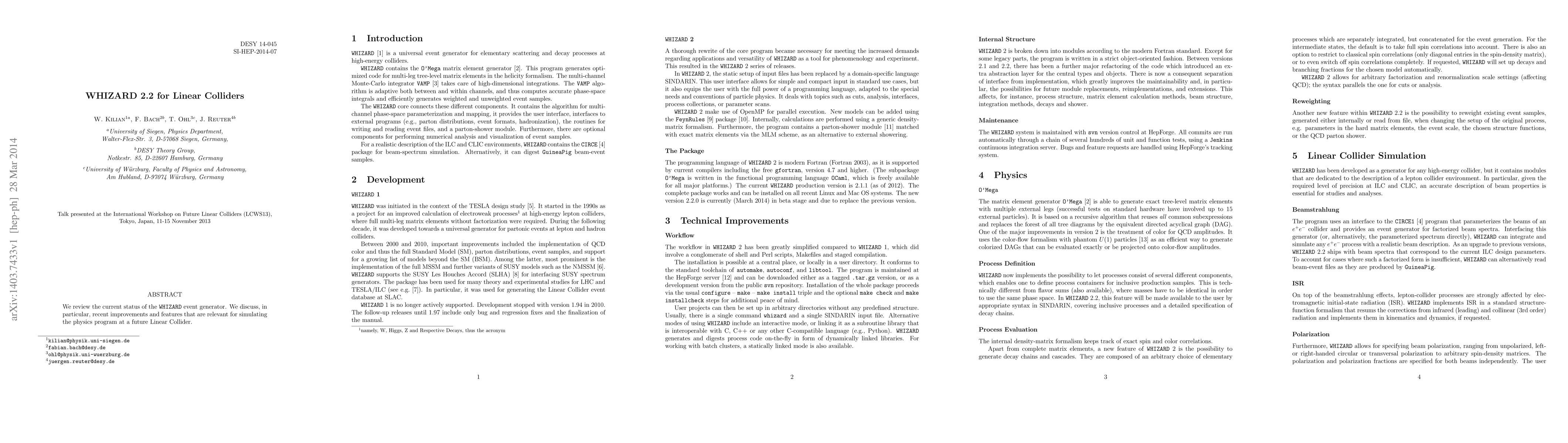 Summary: This paper reviews the latest updates and enhancements of the WHIZARD event generator, focusing on its improved capabilities for simulating the physics experiments planned for future linear colliders. The improvements aim to better support the collider's research program.