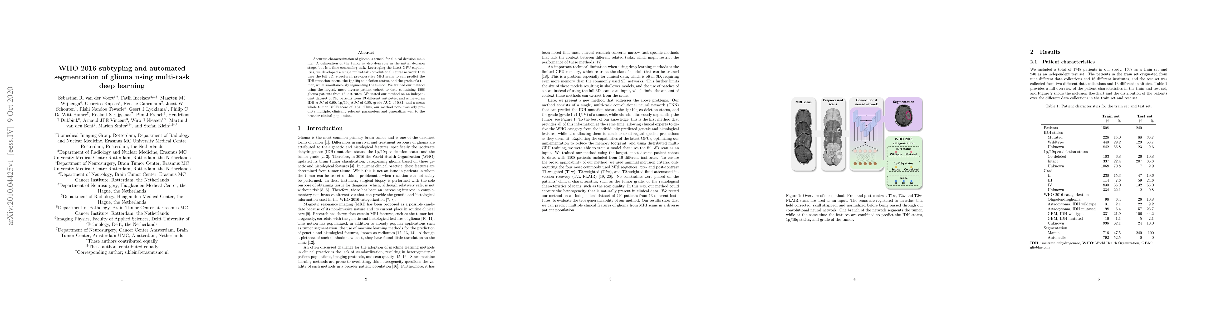 This research developed a multi-task convolutional neural network leveraging 3D MRI scans to predict glioma's IDH mutation, 1p/19q co-deletion, and grade, while segmenting the tumor. The method achieved high accuracy on an independent dataset and generalizes well for clinical use.