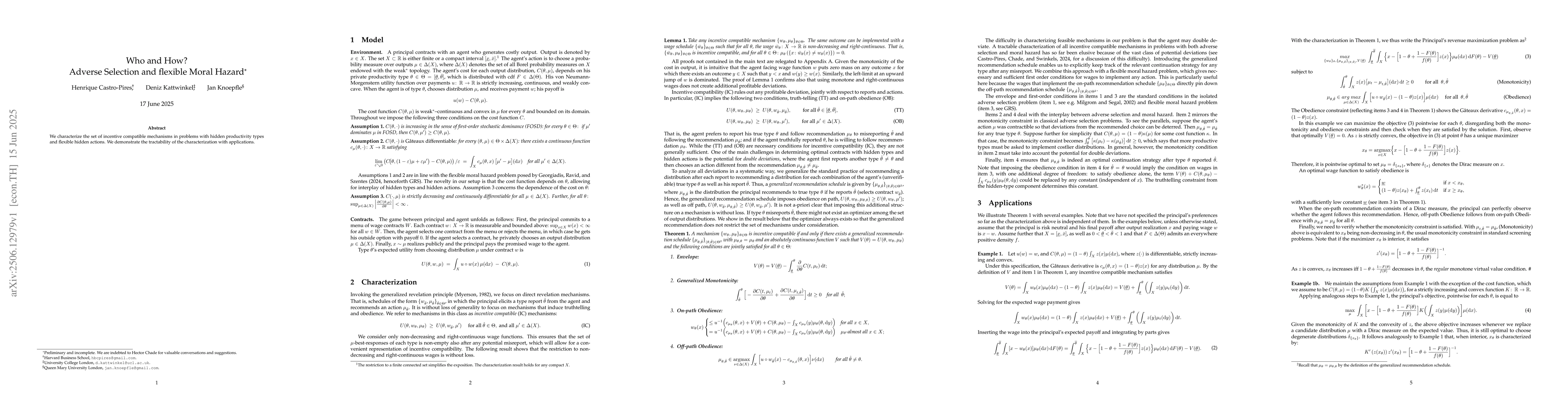 We characterize the set of incentive compatible mechanisms in problems with hidden productivity types and flexible hidden actions. We demonstrate the tractability of the characterization with applications.