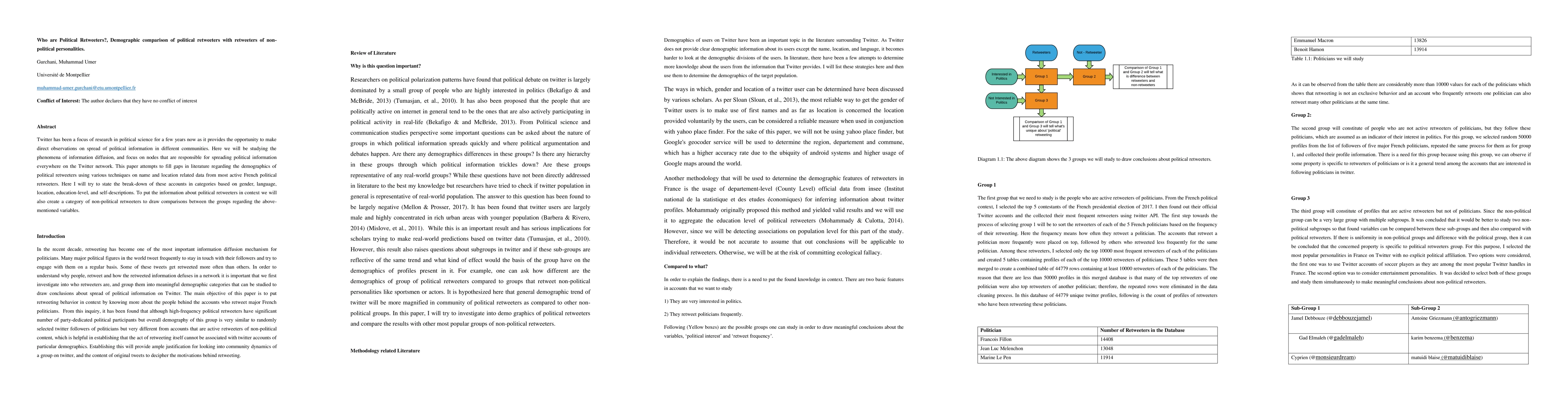 Twitter has been a focus of research in political science for a few years now as it provides the opportunity to make direct observations on the spread of political information in different communities. Here we will be studying the phenomena of information diffusion, and focus on nodes that are responsible for spreading political information everywhere on the Twitter network. This paper attempts to fill gaps in the literature regarding the demographics of political retweeters using various techniques on the name and location-related data from most active French political retweeters. Here I will try to state the break-down of these accounts in categories based on gender, language, location, education level, and self-descriptions. To put the information about political retweeters in context we will also create a category of non-political retweeters to draw comparisons between the groups regarding the above-mentioned variables.