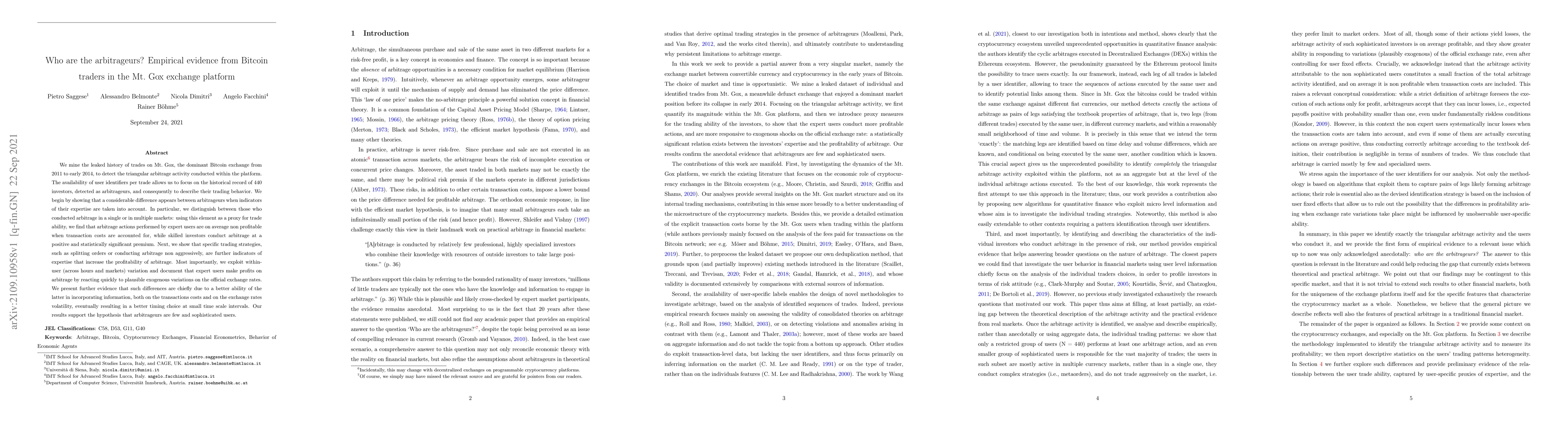 We mine the leaked history of trades on Mt. Gox, the dominant Bitcoin exchange from 2011 to early 2014, to detect the triangular arbitrage activity conducted within the platform. The availability of user identifiers per trade allows us to focus on the historical record of 440 investors, detected as arbitrageurs, and consequently to describe their trading behavior. We begin by showing that a considerable difference appears between arbitrageurs when indicators of their expertise are taken into account. In particular, we distinguish between those who conducted arbitrage in a single or in multiple markets: using this element as a proxy for trade ability, we find that arbitrage actions performed by expert users are on average non-profitable when transaction costs are accounted for, while skilled investors conduct arbitrage at a positive and statistically significant premium. Next, we show that specific trading strategies, such as splitting orders or conducting arbitrage non aggressively, are further indicators of expertise that increase the profitability of arbitrage. Most importantly, we exploit within-user (across hours and markets) variation and document that expert users make profits on arbitrage by reacting quickly to plausible exogenous variations on the official exchange rates. We present further evidence that such differences are chiefly due to a better ability of the latter in incorporating information, both on the transactions costs and on the exchange rates volatility, eventually resulting in a better timing choice at small time scale intervals. Our results support the hypothesis that arbitrageurs are few and sophisticated users.