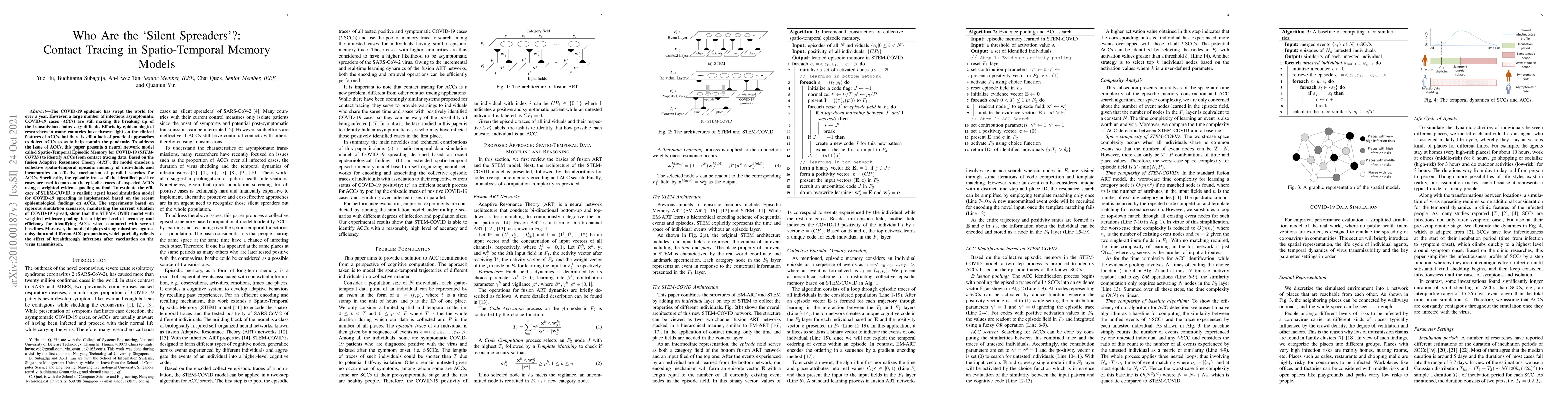 The COVID-19 epidemic has swept the world for over a year. However, a large number of infectious asymptomatic COVID-19 cases (\textit{ACC}s) are still making the breaking up of the transmission chains very difficult. Efforts by epidemiological researchers in many countries have thrown light on the clinical features of ACCs, but there is still a lack of practical approaches to detect ACCs so as to help contain the pandemic. To address the issue of ACCs, this paper presents a neural network model called Spatio-Temporal Episodic Memory for COVID-19 (\textit{STEM-COVID}) to identify ACCs from contact tracing data. Based on the fusion Adaptive Resonance Theory (\textit{ART}), the model encodes a collective spatio-temporal episodic memory of individuals and incorporates an effective mechanism of parallel searches for ACCs. Specifically, the episodic traces of the identified positive cases are used to map out the episodic traces of suspected ACCs using a weighted evidence pooling method. To evaluate the efficacy of STEM-COVID, a realistic agent based simulation model for COVID-19 spreading is implemented based on the recent epidemiological findings on ACCs. The experiments based on rigorous simulation scenarios, manifesting the current situation of COVID-19 spread, show that the STEM-COVID model with weighted evidence pooling has a higher level of accuracy and efficiency for identifying ACCs when compared with several baselines. Moreover, the model displays strong robustness against noisy data and different ACC proportions, which partially reflects the effect of breakthrough infections after vaccination on the virus transmission.