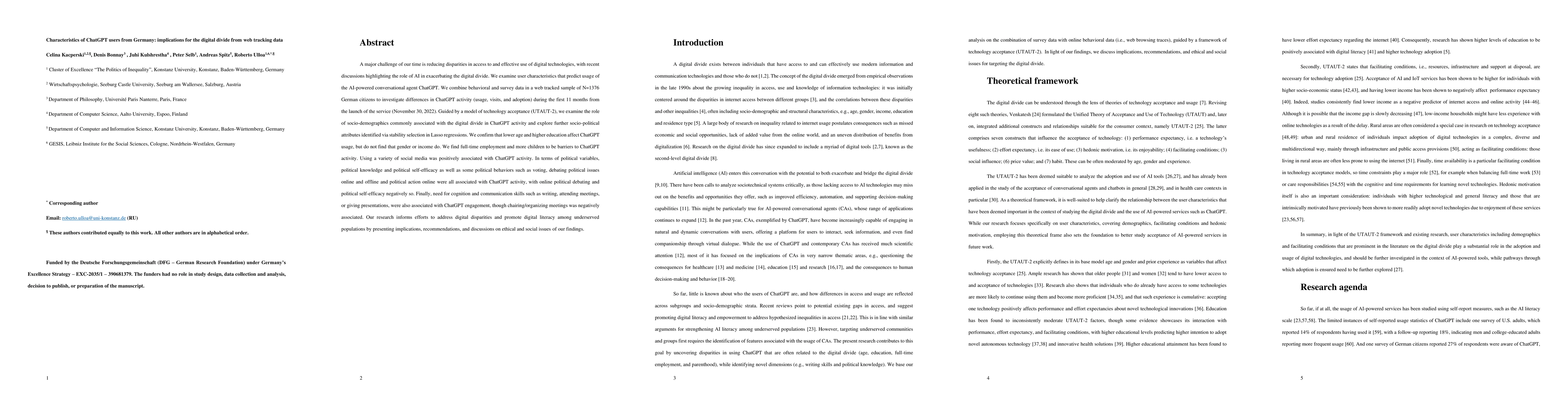 A major challenge of our time is reducing disparities in access to and effective use of digital technologies, with recent discussions highlighting the role of AI in exacerbating the digital divide. We examine user characteristics that predict usage of the AI-powered conversational agent ChatGPT. We combine behavioral (web tracking) and survey data of N=1068 German citizens to investigate differences in ChatGPT activity (usage, visits and duration) in a web tracked sample encompassing a period that covered 8 months from the launch of the service. Guided by a model of technology acceptance (UTAUT-2), we examine socio-demographics commonly associated with the digital divide and explore further socio-political attributes identified via stability selection in Lasso regressions. We confirm lower age and higher education to affect ChatGPT usage, but not gender and income. We find full-time employment and more children to be barriers to ChatGPT activity. Rural residence, writing and social media activities, as well as more political knowledge were positively associated with ChatGPT activity. Our research informs efforts to address digital disparities and promote digital literacy among underserved populations by presenting implications, recommendations and ethical and social issues of our findings.