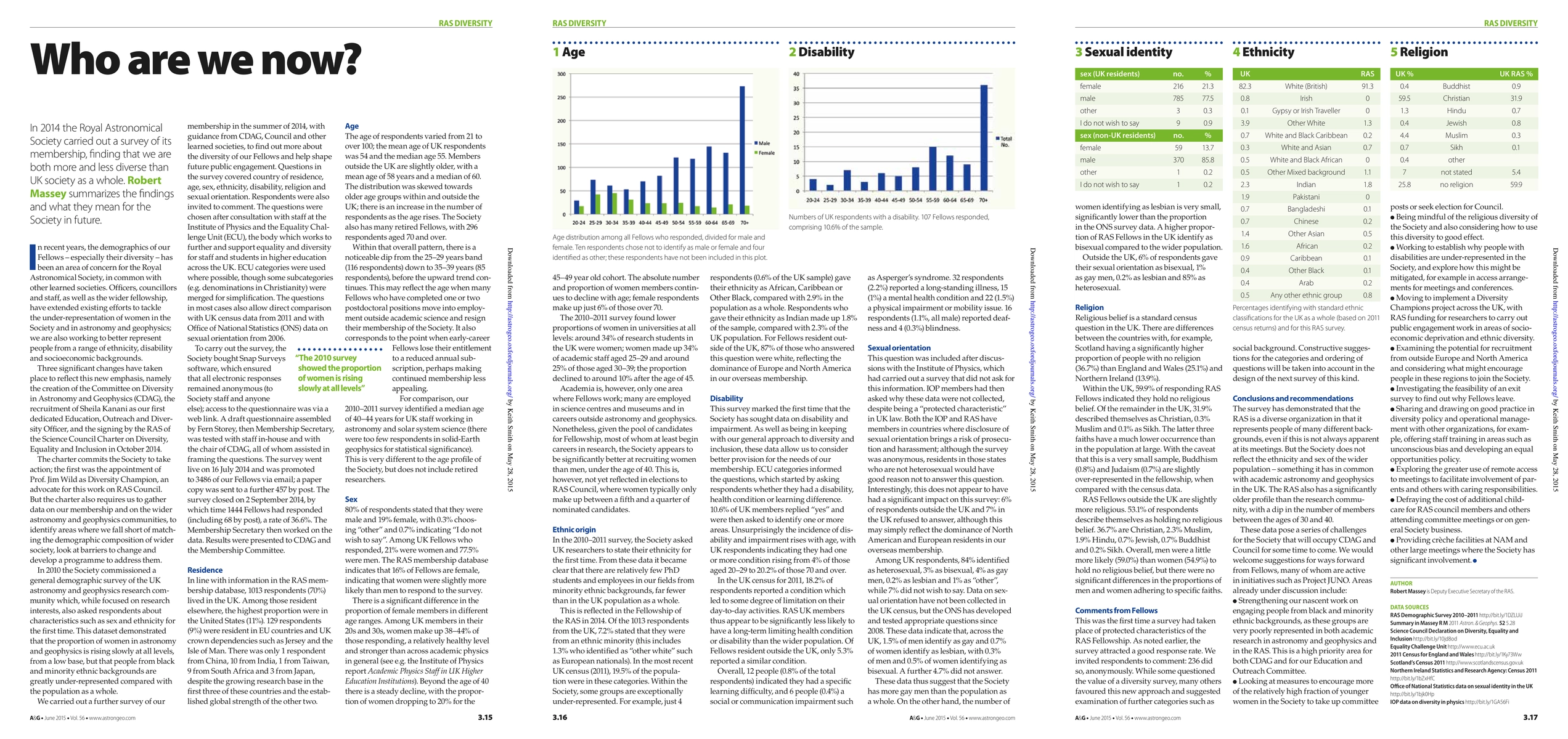 In 2014 the Royal Astronomical Society carried out a survey of its membership, finding that we are both more and less diverse than UK society as a whole. Robert Massey summarizes the findings and what they mean for the Society in future.