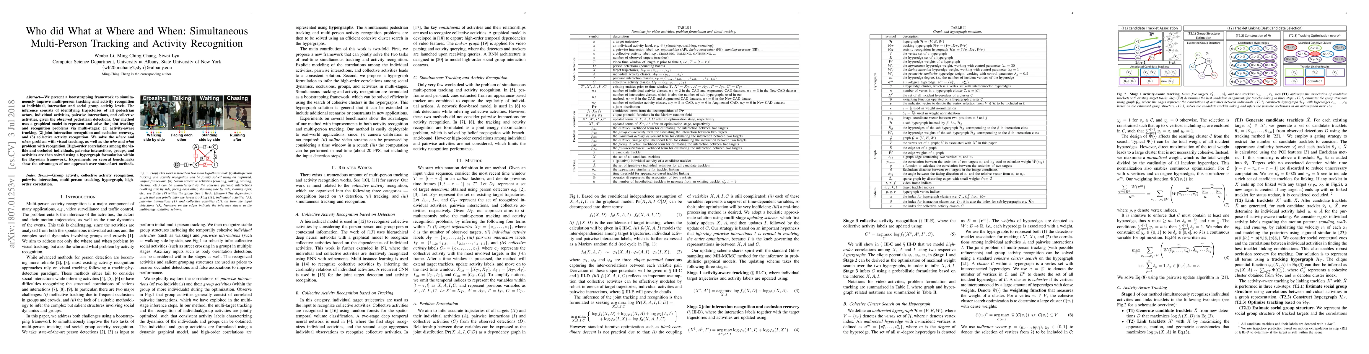 This paper introduces a framework for simultaneous multi-person tracking and activity recognition, employing a graphical model to solve joint tracking and recognition problems through stages of activity-aware tracking, interaction recognition, and collective activity recognition. The method leverages high-order correlations and a hypergraph formulation within a Bayesian framework to outperform state-of-the-art methods on benchmarks.