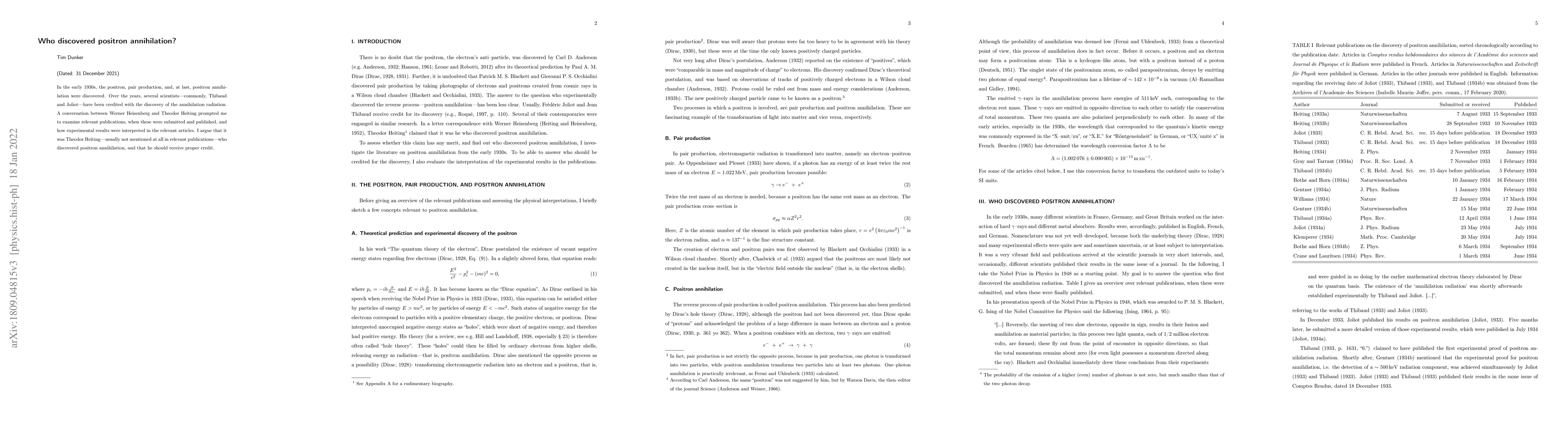 Summary: The discovery of positron annihilation is often attributed to Thibaud and Joliot, but a detailed examination of historical publications suggests that Theodor Heiting, who is usually overlooked, should receive credit for this discovery.