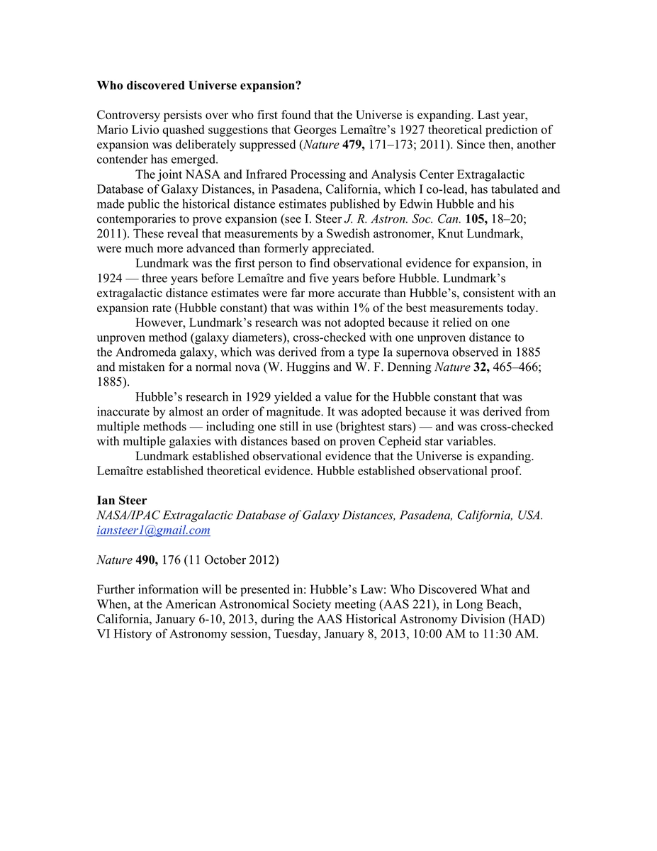 Lundmark established observational evidence that the Universe is expanding. Lema\^itre established theoretical evidence. Hubble established observational proof.