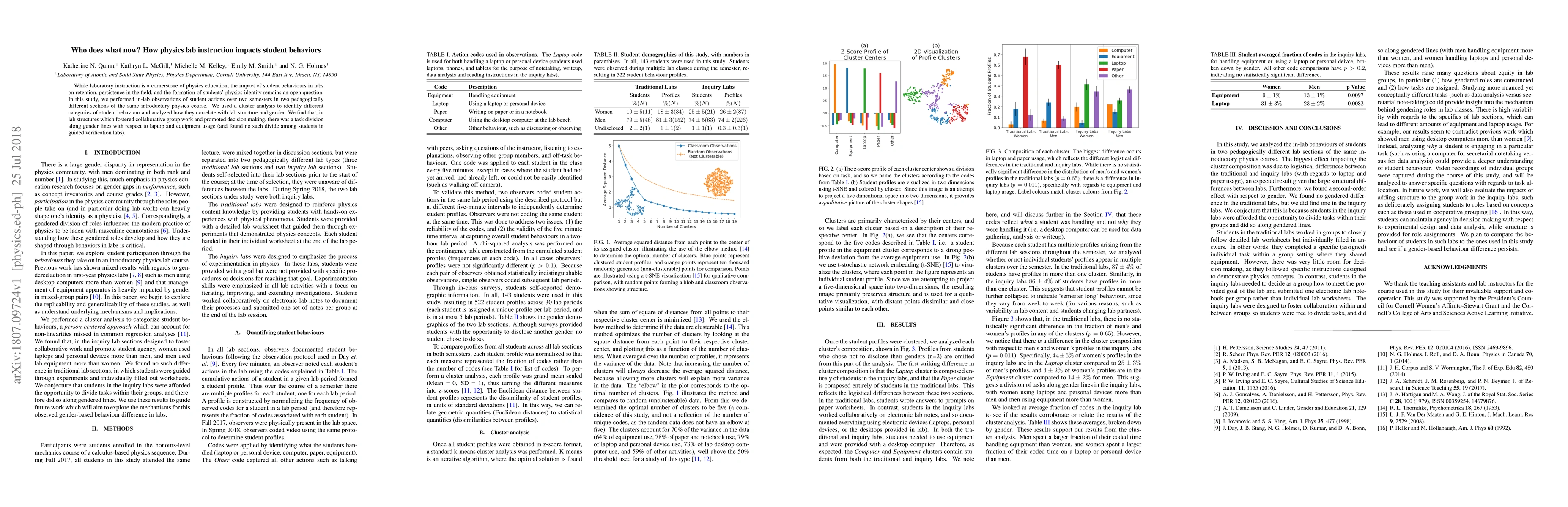 While laboratory instruction is a cornerstone of physics education, the impact of student behaviours in labs on retention, persistence in the field, and the formation of students' physics identity remains an open question. In this study, we performed in-lab observations of student actions over two semesters in two pedagogically different sections of the same introductory physics course. We used a cluster analysis to identify different categories of student behaviour and analyzed how they correlate with lab structure and gender. We find that, in lab structures which fostered collaborative group work and promoted decision making, there was a task division along gender lines with respect to laptop and equipment usage (and found no such divide among students in guided verification labs).