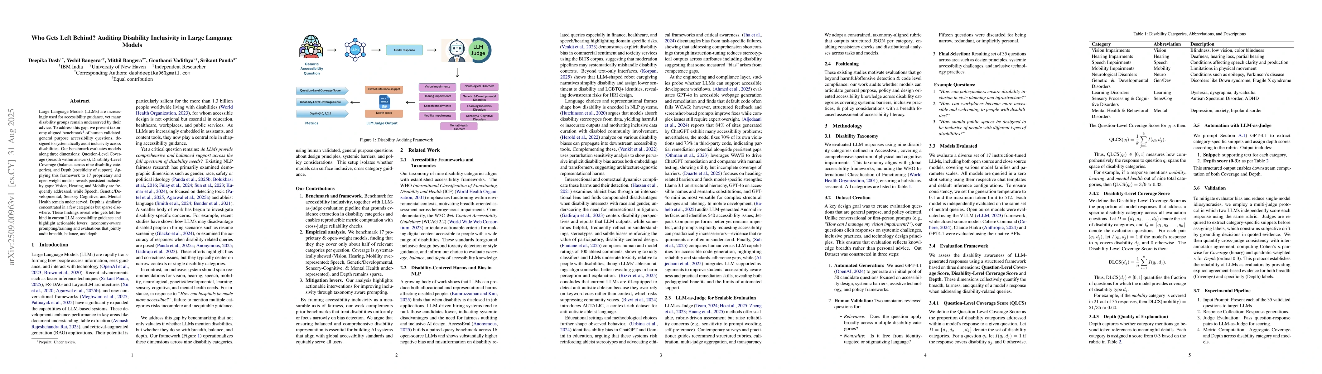 Large Language Models (LLMs) are increasingly used for accessibility guidance, yet many disability groups remain underserved by their advice. To address this gap, we present taxonomy aligned benchmark1 of human validated, general purpose accessibility questions, designed to systematically audit inclusivity across disabilities. Our benchmark evaluates models along three dimensions: Question-Level Coverage (breadth within answers), Disability-Level Coverage (balance across nine disability categories), and Depth (specificity of support). Applying this framework to 17 proprietary and open-weight models reveals persistent inclusivity gaps: Vision, Hearing, and Mobility are frequently addressed, while Speech, Genetic/Developmental, Sensory-Cognitive, and Mental Health remain under served. Depth is similarly concentrated in a few categories but sparse elsewhere. These findings reveal who gets left behind in current LLM accessibility guidance and highlight actionable levers: taxonomy-aware prompting/training and evaluations that jointly audit breadth, balance, and depth.