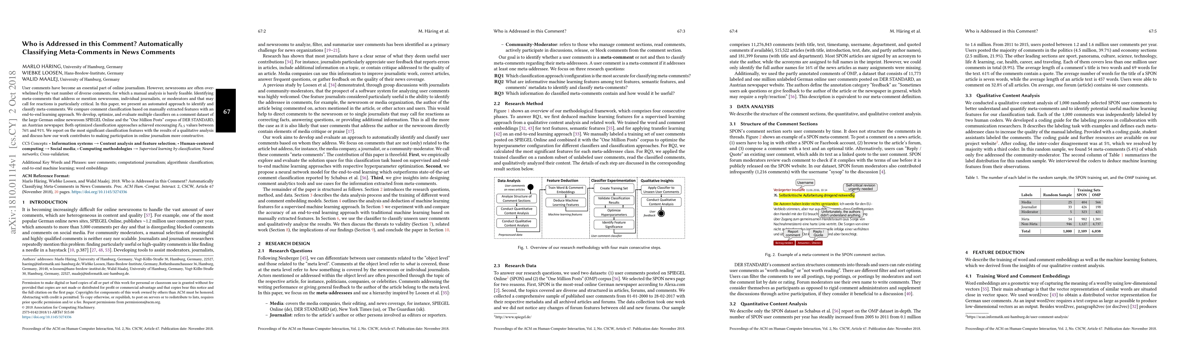 User comments have become an essential part of online journalism. However, newsrooms are often overwhelmed by the vast number of diverse comments, for which a manual analysis is barely feasible. Identifying meta-comments that address or mention newsrooms, individual journalists, or moderators and that may call for reactions is particularly critical. In this paper, we present an automated approach to identify and classify meta-comments. We compare comment classification based on manually extracted features with an end-to-end learning approach. We develop, optimize, and evaluate multiple classifiers on a comment dataset of the large German online newsroom SPIEGEL Online and the 'One Million Posts' corpus of DER STANDARD, an Austrian newspaper. Both optimized classification approaches achieved encouraging $F_{0.5}$ values between 76% and 91%. We report on the most significant classification features with the results of a qualitative analysis and discuss how our work contributes to making participation in online journalism more constructive.