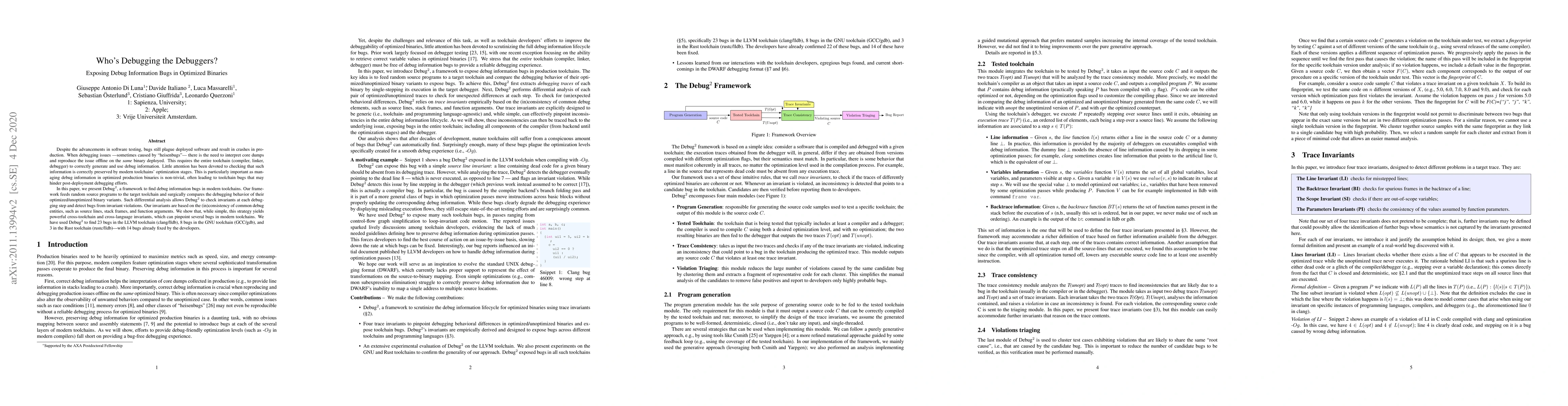 This paper introduces Debug$^{2}$, a framework to identify bugs in debug information preservation within modern toolchains during optimization. By comparing optimized and unoptimized binaries, Debug$^{2}$ detects inconsistencies in debug entities, uncovering 23, 8, and 3 bugs in the LLVM, GNU, and Rust toolchains respectively, with 14 bugs already addressed by developers.