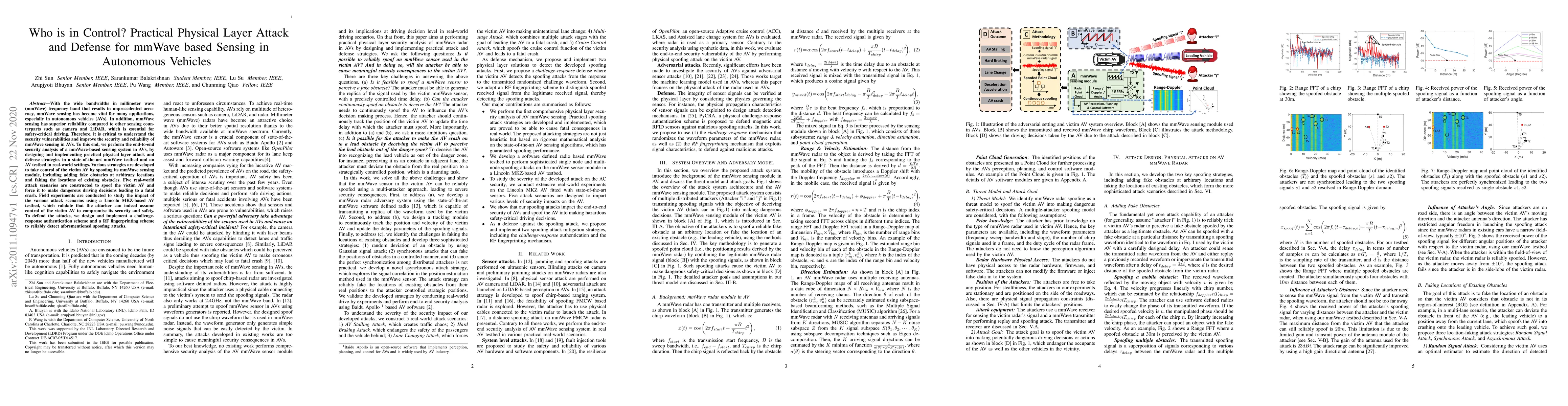 This paper explores security vulnerabilities in mmWave sensing for autonomous vehicles (AVs) by demonstrating practical physical layer attacks that can spoof mmWave sensors, leading to dangerous driving decisions. It also proposes defense mechanisms, including a challenge-response authentication and RF fingerprinting, to mitigate these attacks.