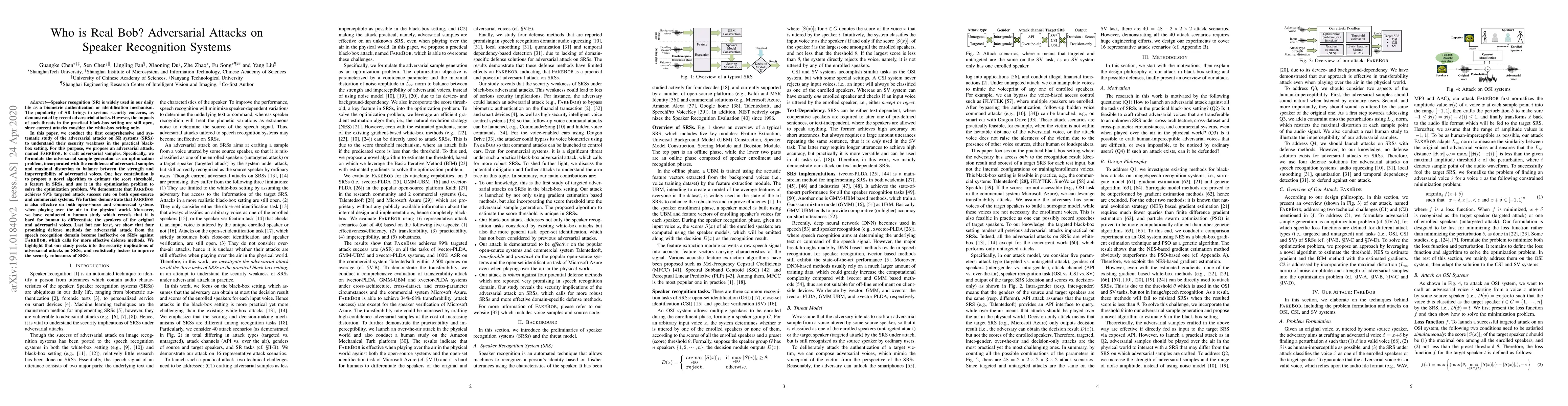 This paper explores adversarial attacks on speaker recognition systems (SRSs) in a practical black-box setting, proposing an attack method named FAKEBOB that achieves a 99% success rate. It demonstrates the attack's effectiveness in both open-source and commercial systems, highlighting the need for more effective defense strategies against such threats.
