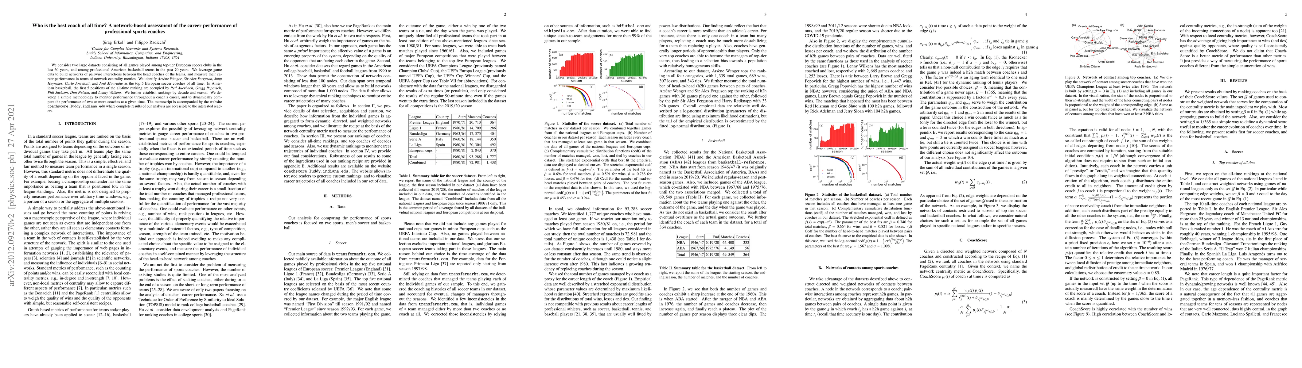 We consider two large datasets consisting of all games played among top-tier European soccer clubs in the last 60 years, and among professional American basketball teams in the past 70 years. We leverage game data to build networks of pairwise interactions between the head coaches of the teams, and measure their career performance in terms of network centrality metrics. We identify Arsene Wenger, Sir Alex Ferguson, Jupp Heynckes, Carlo Ancelotti, and Jose Mourinho as the top 5 European soccer coaches of all time. In American basketball, the first 5 positions of the all-time ranking are occupied by Red Auerbach, Gregg Popovich, Phil Jackson, Don Nelson, and Lenny Wilkens. We further establish rankings by decade and season. We develop a simple methodology to monitor performance throughout a coach's career, and to dynamically compare the performance of two or more coaches at a given time. The manuscript is accompanied by the website coachscore.luddy.indiana.edu where complete results of our analysis are accessible to the interested readers.