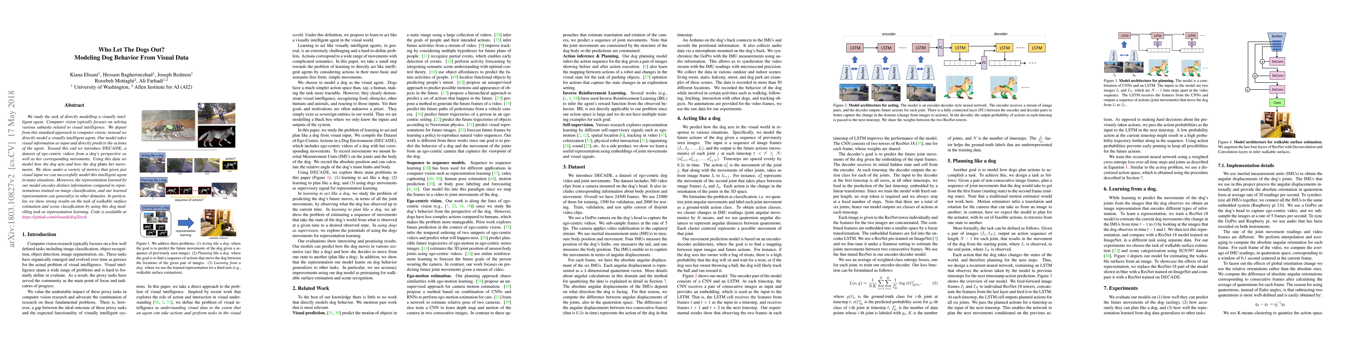 We introduce the task of directly modeling a visually intelligent agent. Computer vision typically focuses on solving various subtasks related to visual intelligence. We depart from this standard approach to computer vision; instead we directly model a visually intelligent agent. Our model takes visual information as input and directly predicts the actions of the agent. Toward this end we introduce DECADE, a large-scale dataset of ego-centric videos from a dog's perspective as well as her corresponding movements. Using this data we model how the dog acts and how the dog plans her movements. We show under a variety of metrics that given just visual input we can successfully model this intelligent agent in many situations. Moreover, the representation learned by our model encodes distinct information compared to representations trained on image classification, and our learned representation can generalize to other domains. In particular, we show strong results on the task of walkable surface estimation by using this dog modeling task as representation learning.