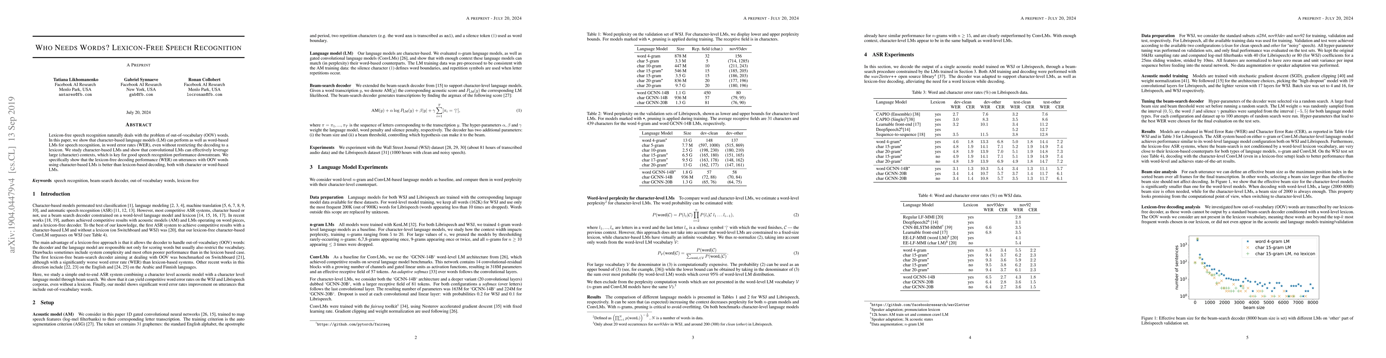 This paper demonstrates that lexicon-free speech recognition using character-based language models can achieve performance comparable to word-based models, particularly excelling in handling out-of-vocabulary words. The study finds that convolutional LMs leveraging large character contexts outperform lexicon-based methods in decoding performance.