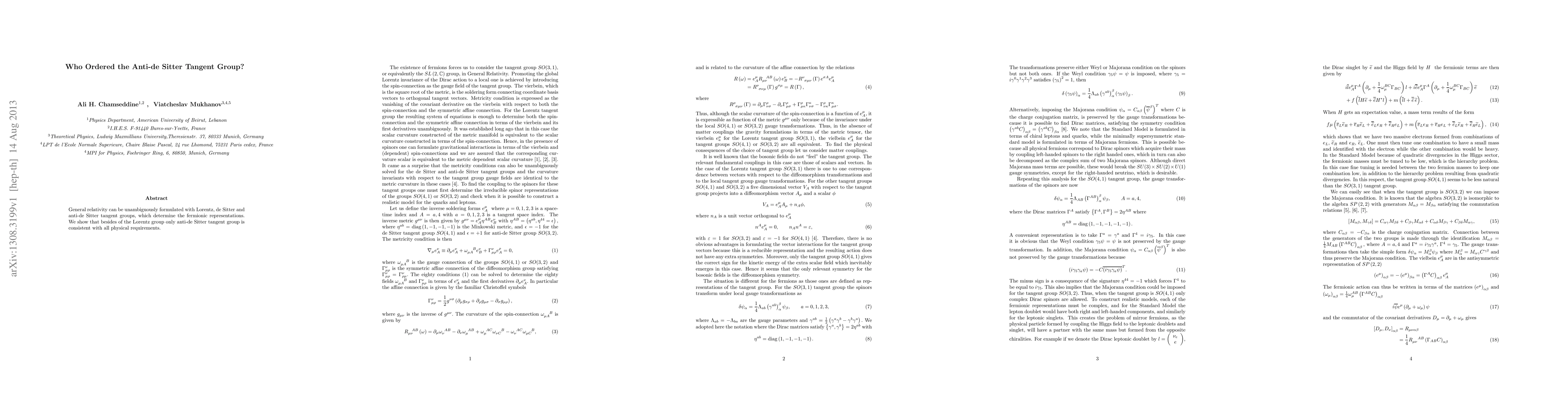 This paper discusses how general relativity can be formulated with different tangent groups, specifically Lorentz, de Sitter, and anti-de Sitter. The study concludes that only the anti-de Sitter tangent group aligns with all necessary physical requirements for fermionic representations.